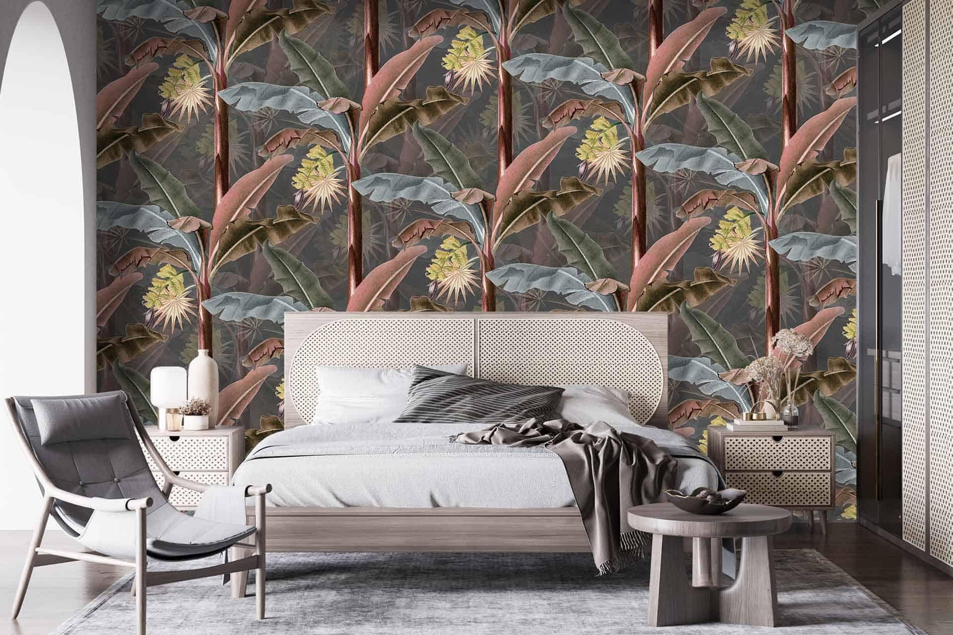 Vibrant floral and bird wallpaper featuring colorful flowers and birds in lively patterns, with bold hues of pink, green, blue, and yellow creating a dynamic focal point in the room.