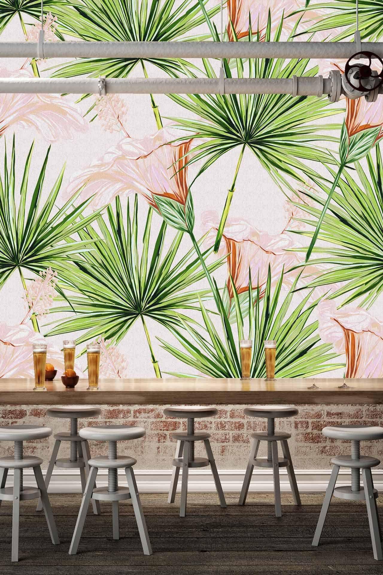 Vibrant floral and bird wallpaper featuring colorful flowers and birds in lively patterns, with bold hues of pink, green, blue, and yellow creating a dynamic focal point in the room.