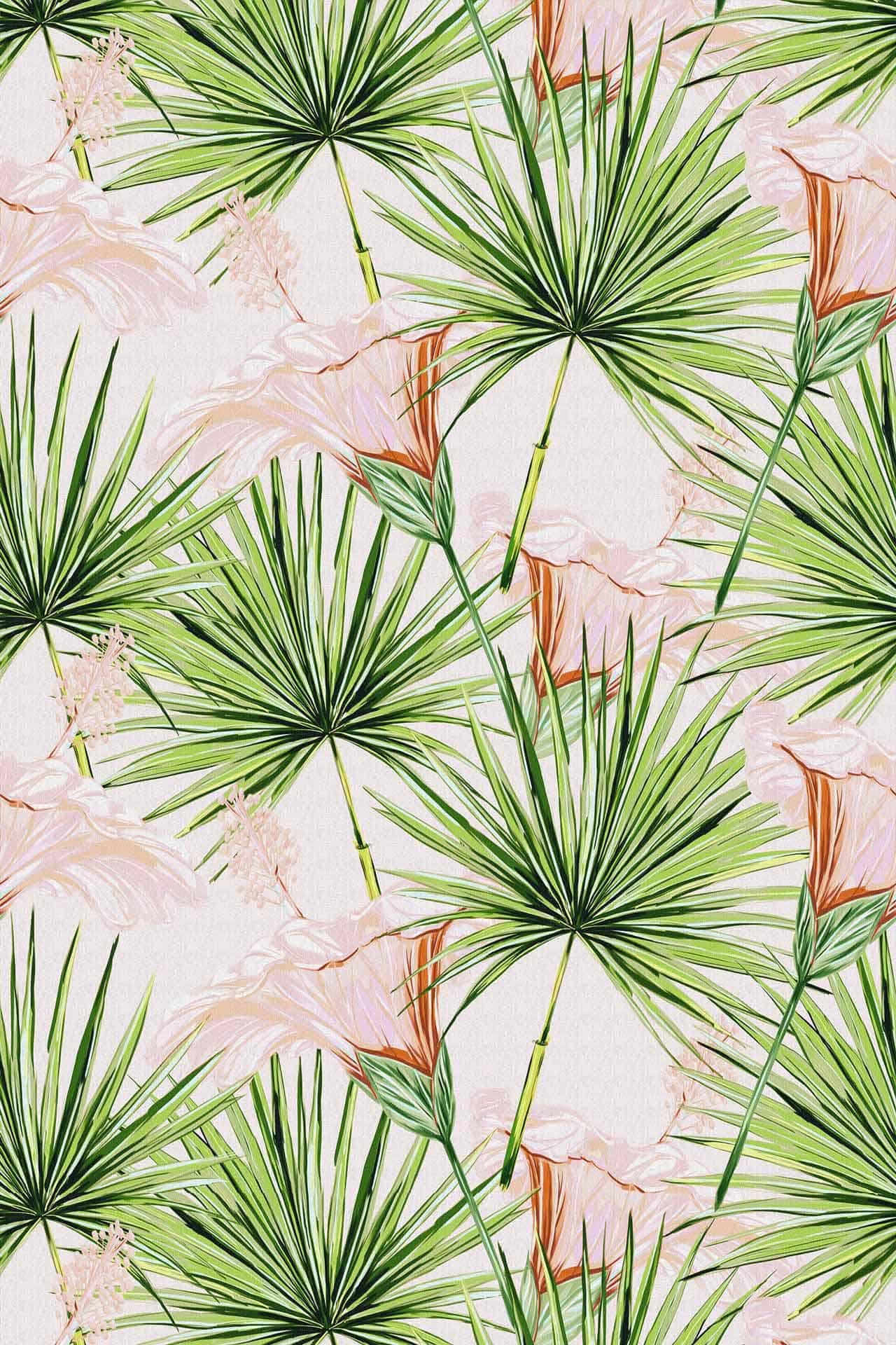 The bathroom features decorative wallpaper with bold, colorful floral patterns in shades of pink, green, and white. The distinctive wallpaper adds a vibrant backdrop behind the vanity and mirrors, easily highlighting its eye-catching design for search.