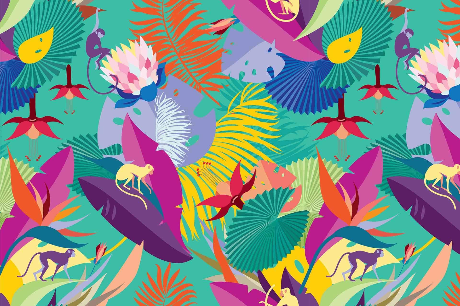 Vibrant floral and bird wallpaper featuring colorful flowers and birds in lively patterns, with bold hues of pink, green, blue, and yellow creating a dynamic focal point in the room.