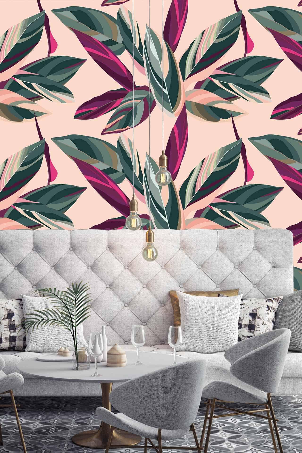Vibrant floral and bird wallpaper featuring colorful flowers and birds in lively patterns, with bold hues of pink, green, blue, and yellow creating a dynamic focal point in the room.