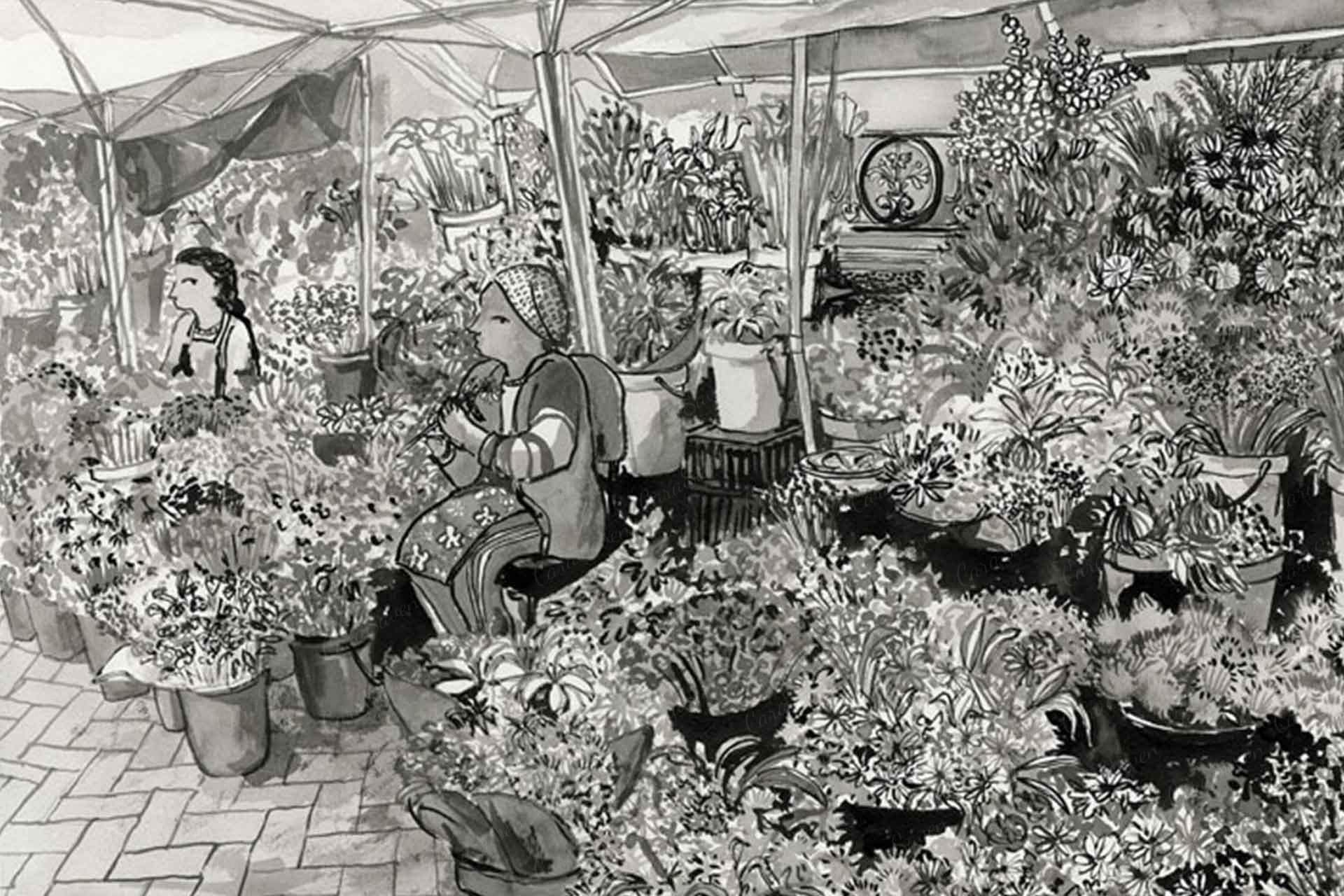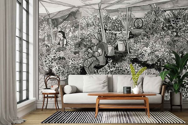 Adderley Street Flower Sellers is a wallpaper design that forms part of our CS&Co collection. It is by the artist Lucie Demoyencourt. As with all our designs, it will be redesigned to suit your wall size and shape.