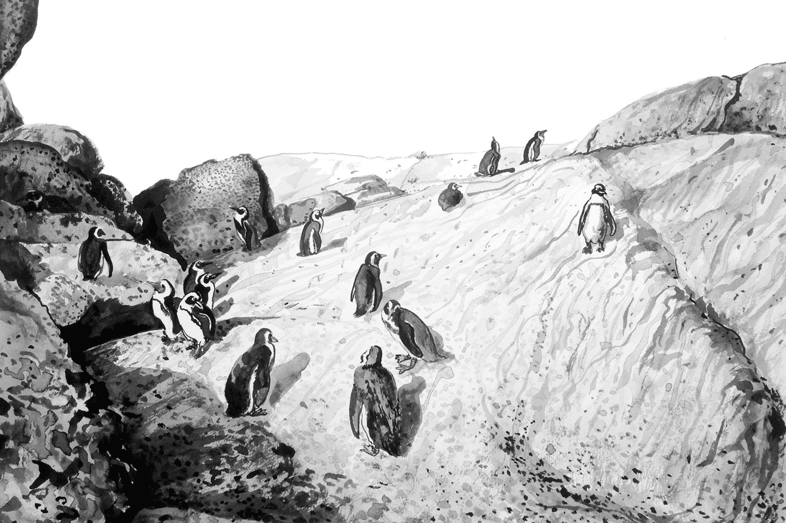 Boulders Penguins is a wallpaper design that forms part of our CS&Co collection. It is by the artist Lucie Demoyencourt. As with all our designs, it will be redesigned to suit your wall size and shape.