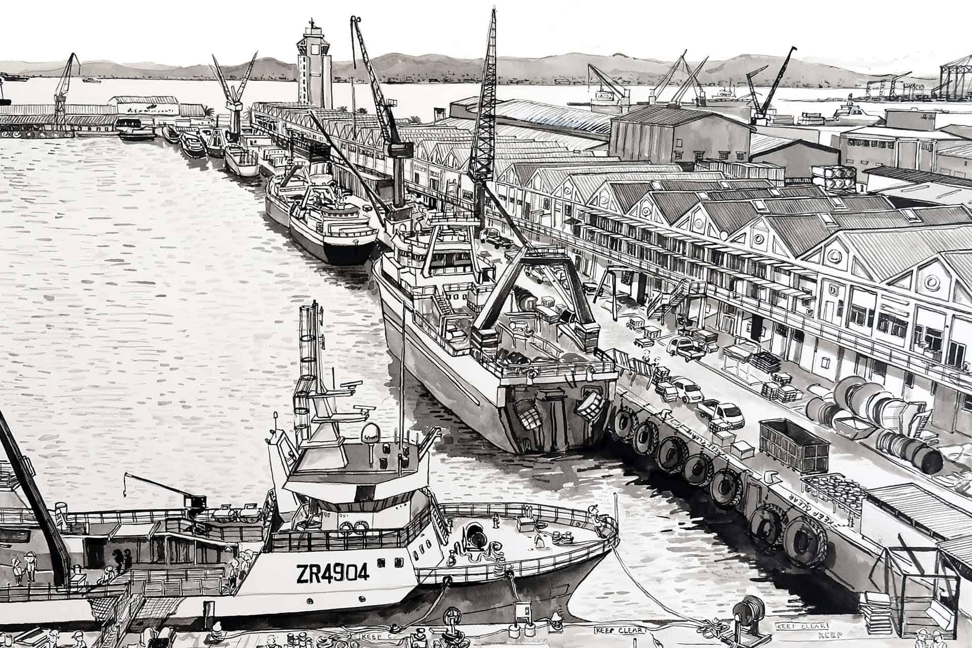 Cape Town Harbour is a wallpaper design that forms part of our CS&Co collection. It is by the artist Lucie Demoyencourt. As with all our designs, it will be redesigned to suit your wall size and shape.