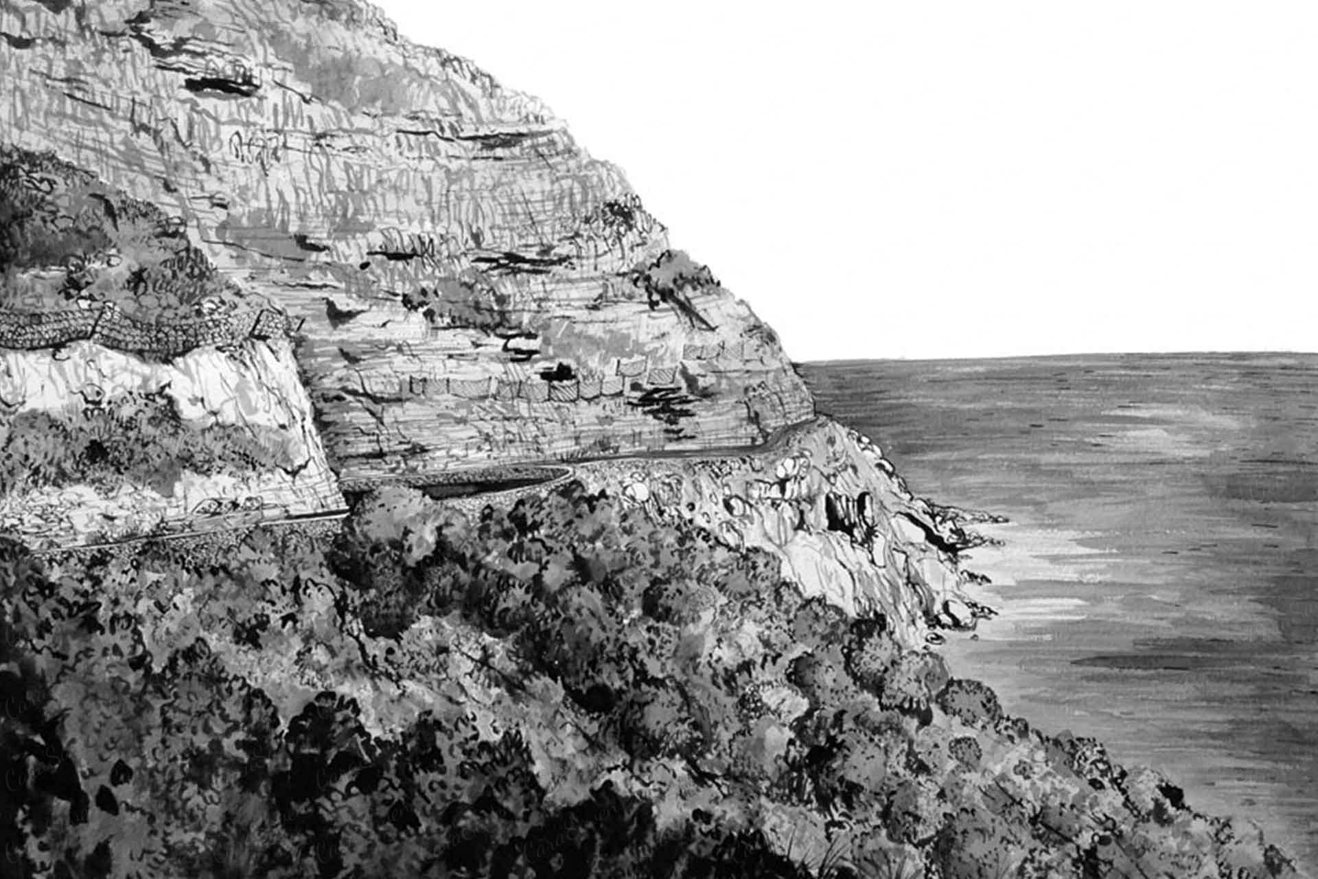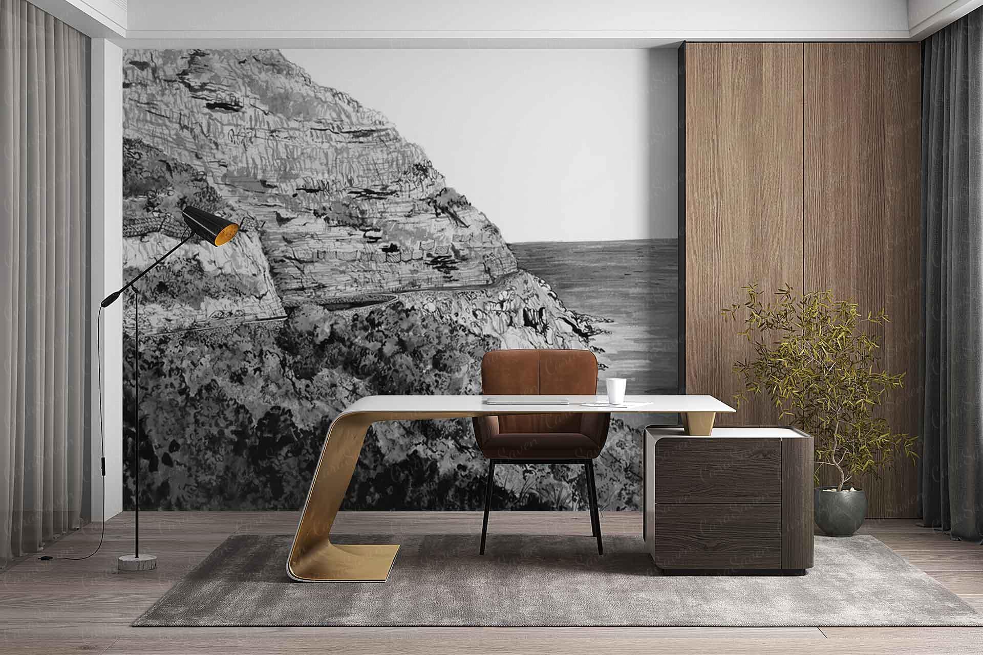 Chapmans Peak Drive is a wallpaper design that forms part of our CS&Co collection. It is by the artist Lucie Demoyencourt. As with all our designs, it will be redesigned to suit your wall size and shape.