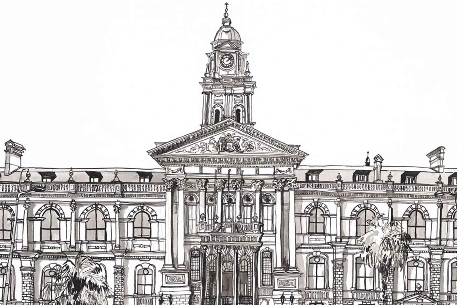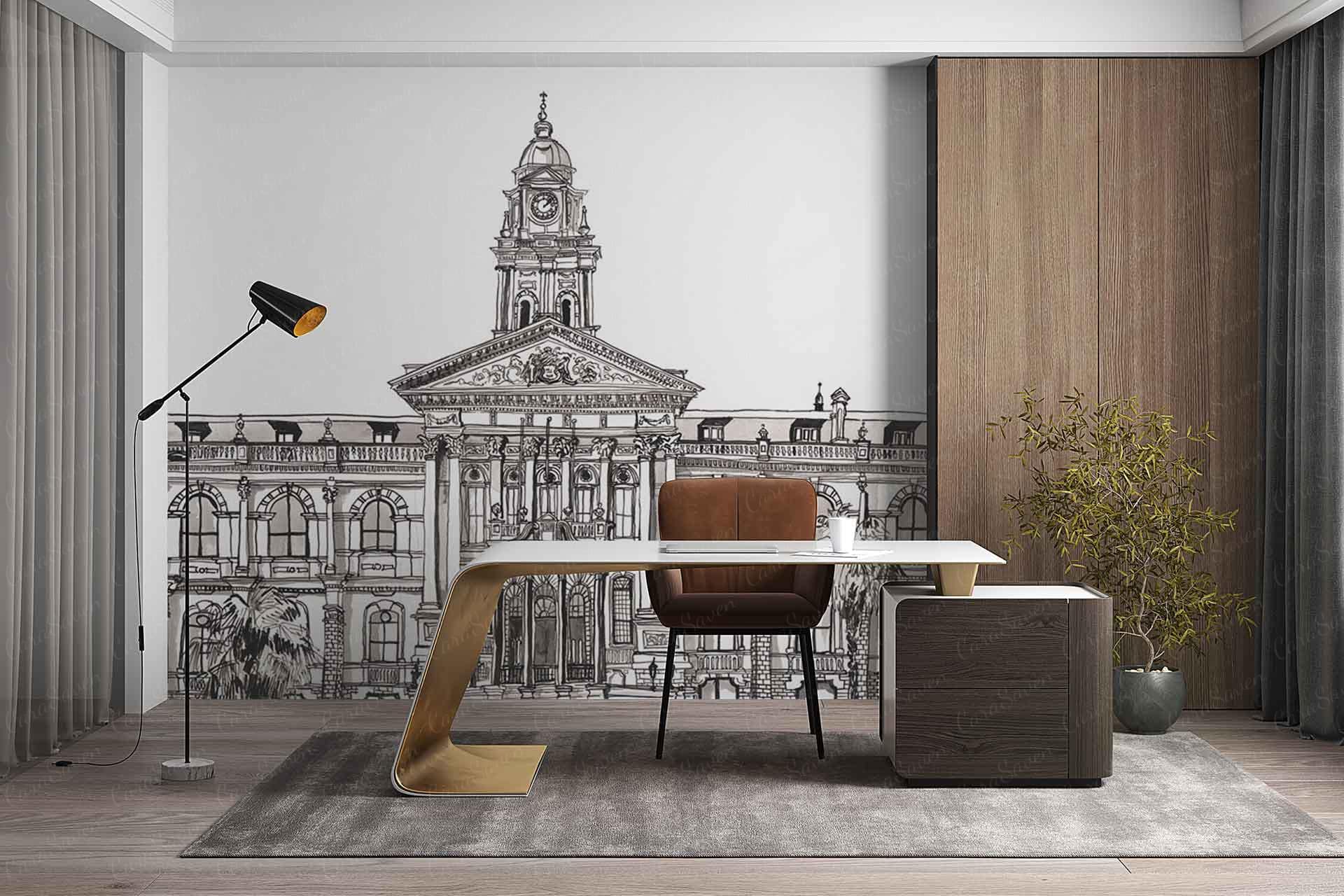 City Hall Facade is a wallpaper design that forms part of our CS&Co collection. It is by the artist Lucie Demoyencourt. As with all our designs, it will be redesigned to suit your wall size and shape.