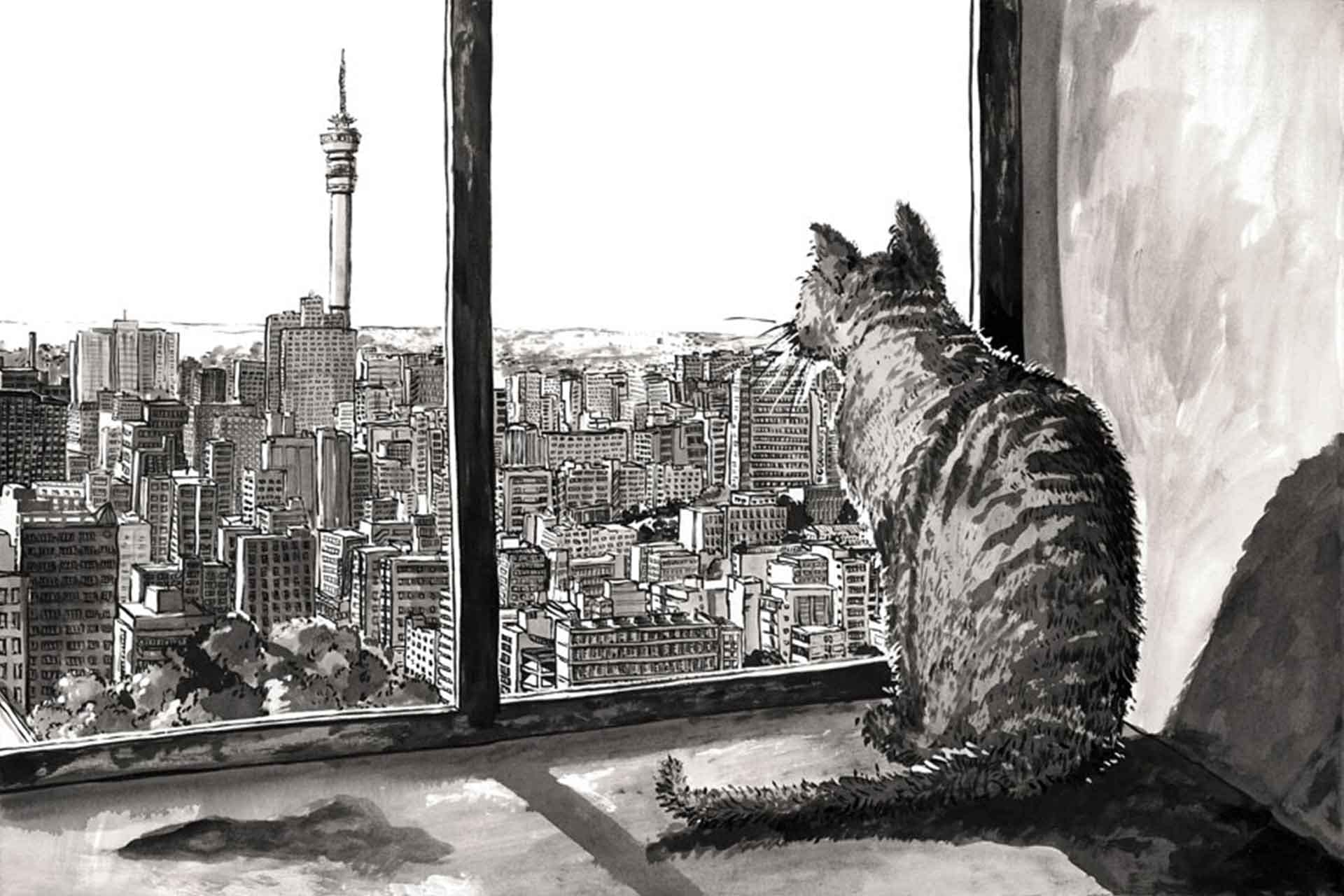 Hillbrow Pussy with a View is a wallpaper design that forms part of our CS&Co collection. It is by the artist Lucie Demoyencourt. As with all our designs, it will be redesigned to suit your wall size and shape.