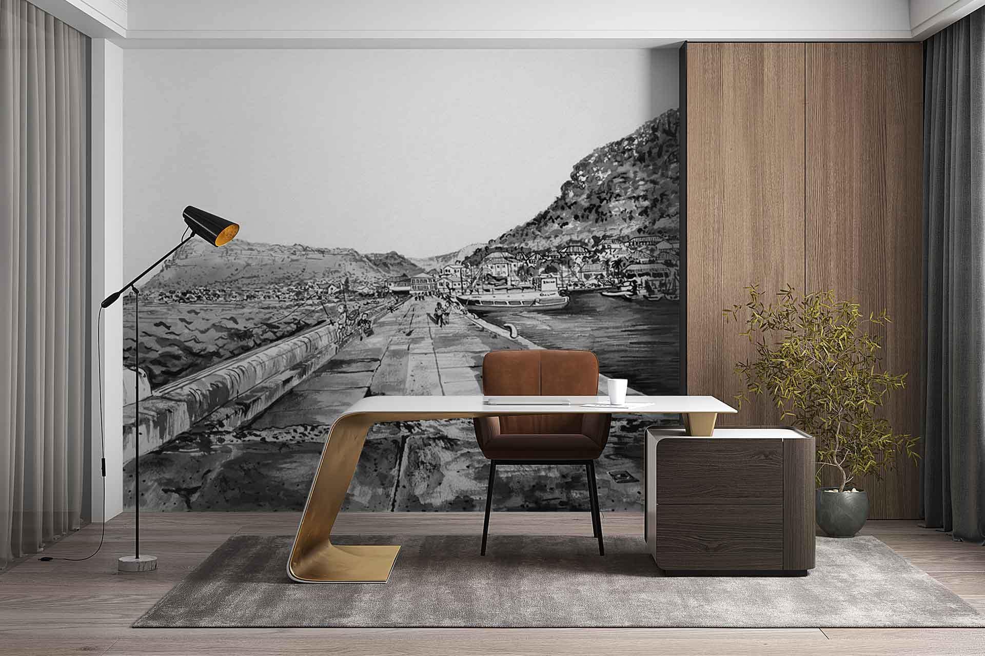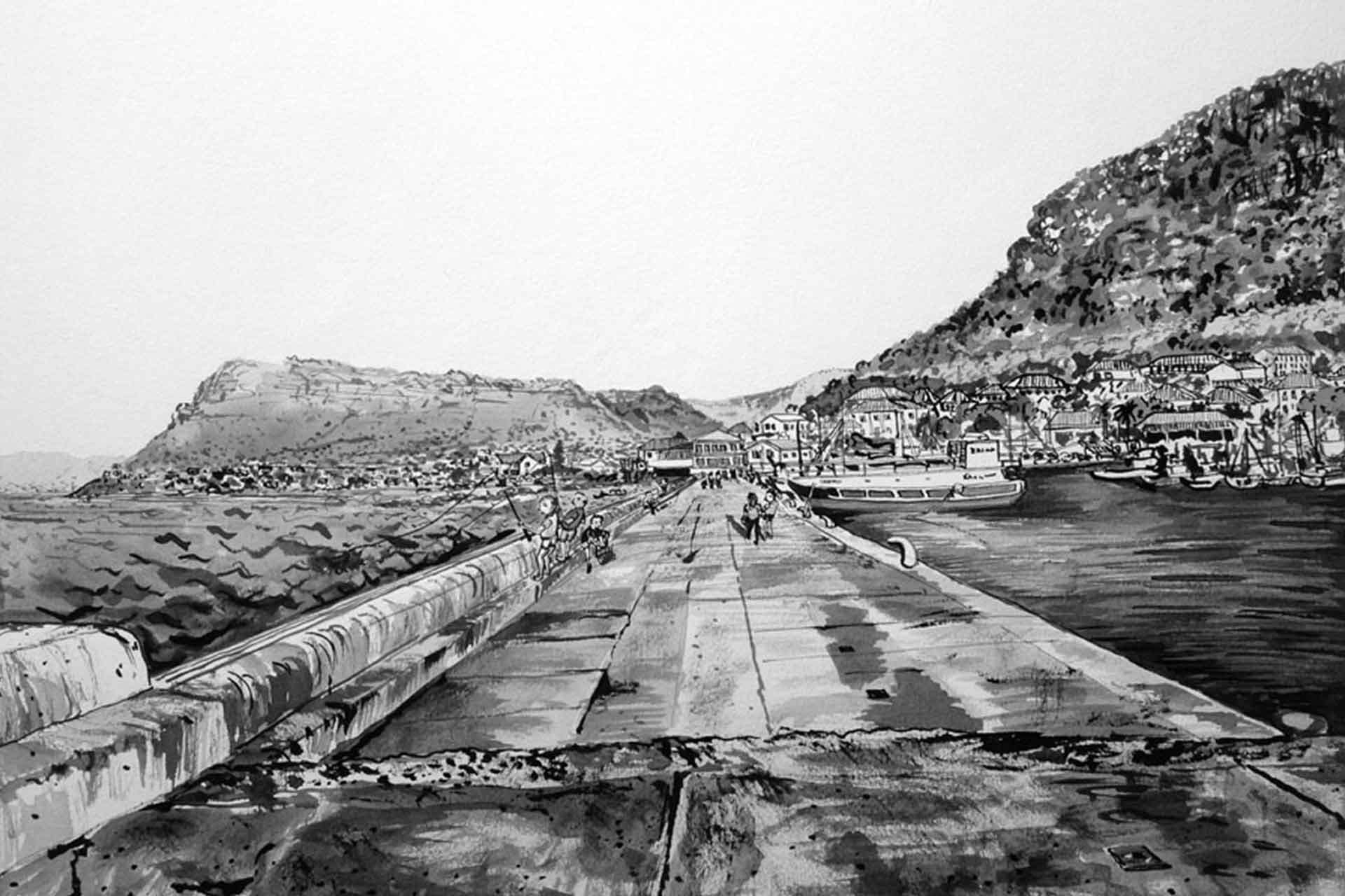 Kalk Bay Harbour is a wallpaper design that forms part of our CS&Co collection. It is by the artist Lucie Demoyencourt. As with all our designs, it will be redesigned to suit your wall size and shape.