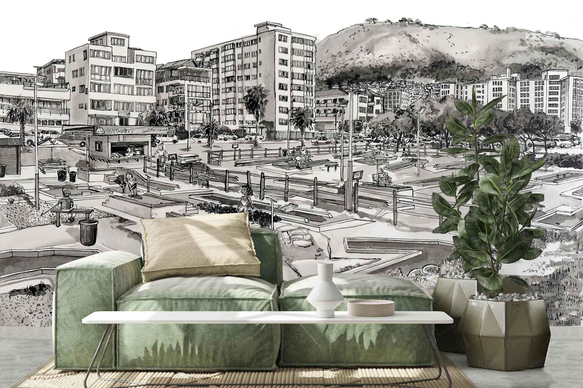 Putt Putt, Mouille Point is a wallpaper design that forms part of our CS&Co collection. It is by the artist Lucie Demoyencourt. As with all our designs, it will be redesigned to suit your wall size and shape.
