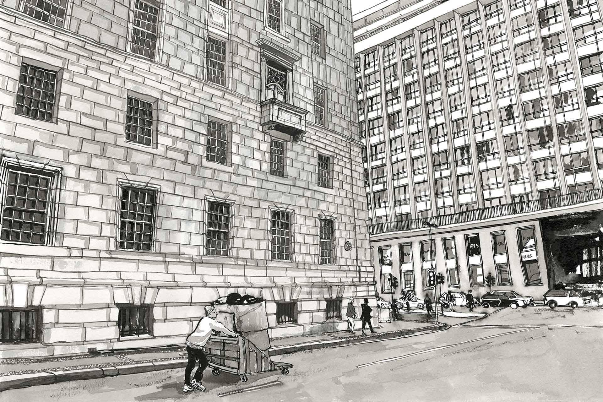 Queen Victoria Street is a wallpaper design that forms part of our CS&Co collection. It is by the artist Lucie Demoyencourt. As with all our designs, it will be redesigned to suit your wall size and shape.