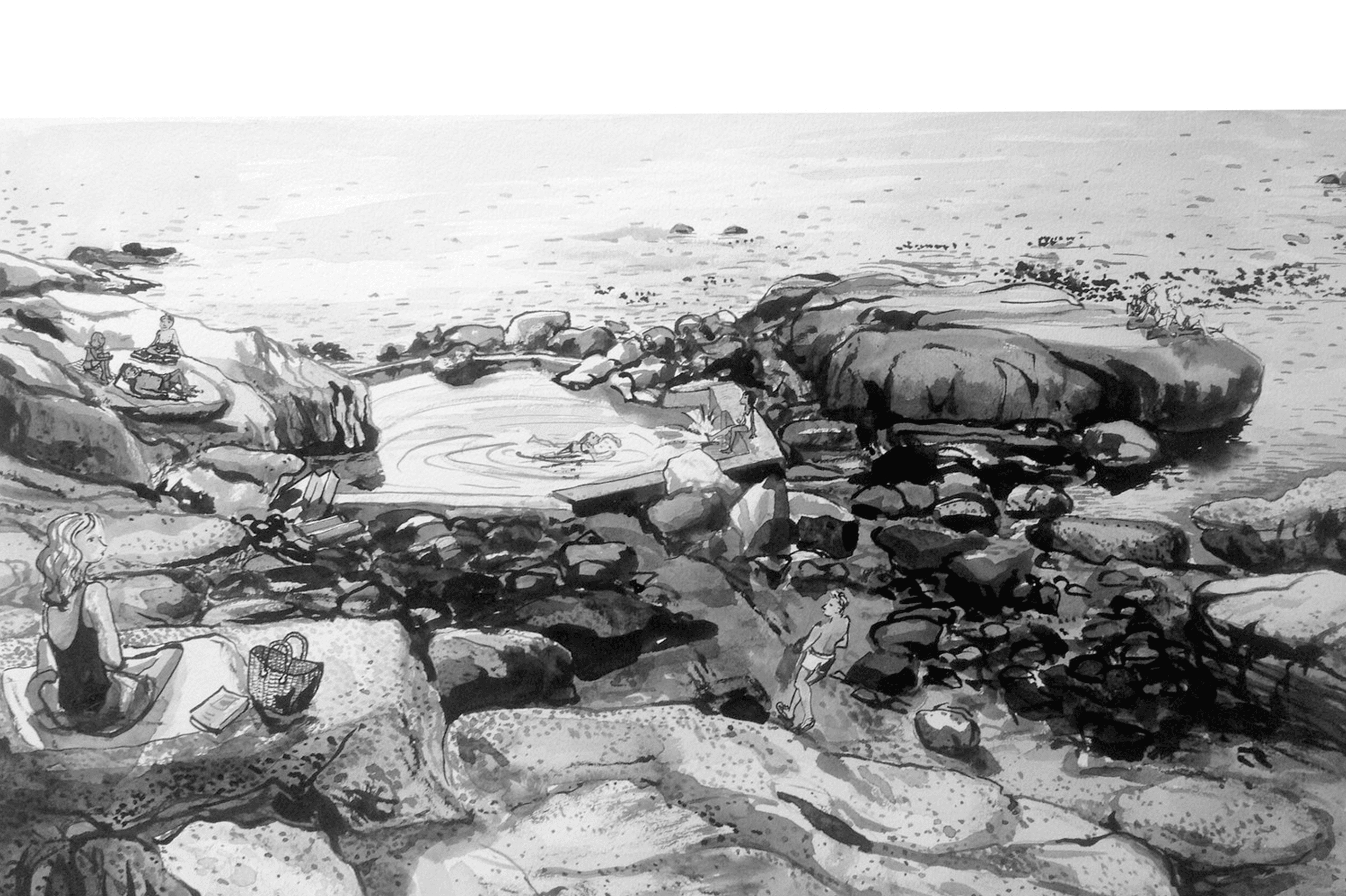 Saunders Rock Pool is a wallpaper design that forms part of our CS&Co collection. It is by the artist Lucie Demoyencourt. As with all our designs, it will be redesigned to suit your wall size and shape.