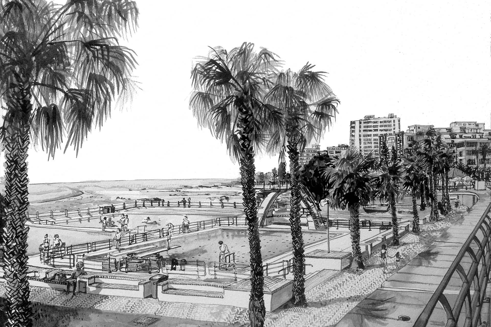 Sea Point Pools is a wallpaper design that forms part of our CS&Co collection. It is by the artist Lucie Demoyencourt. As with all our designs, it will be redesigned to suit your wall size and shape.