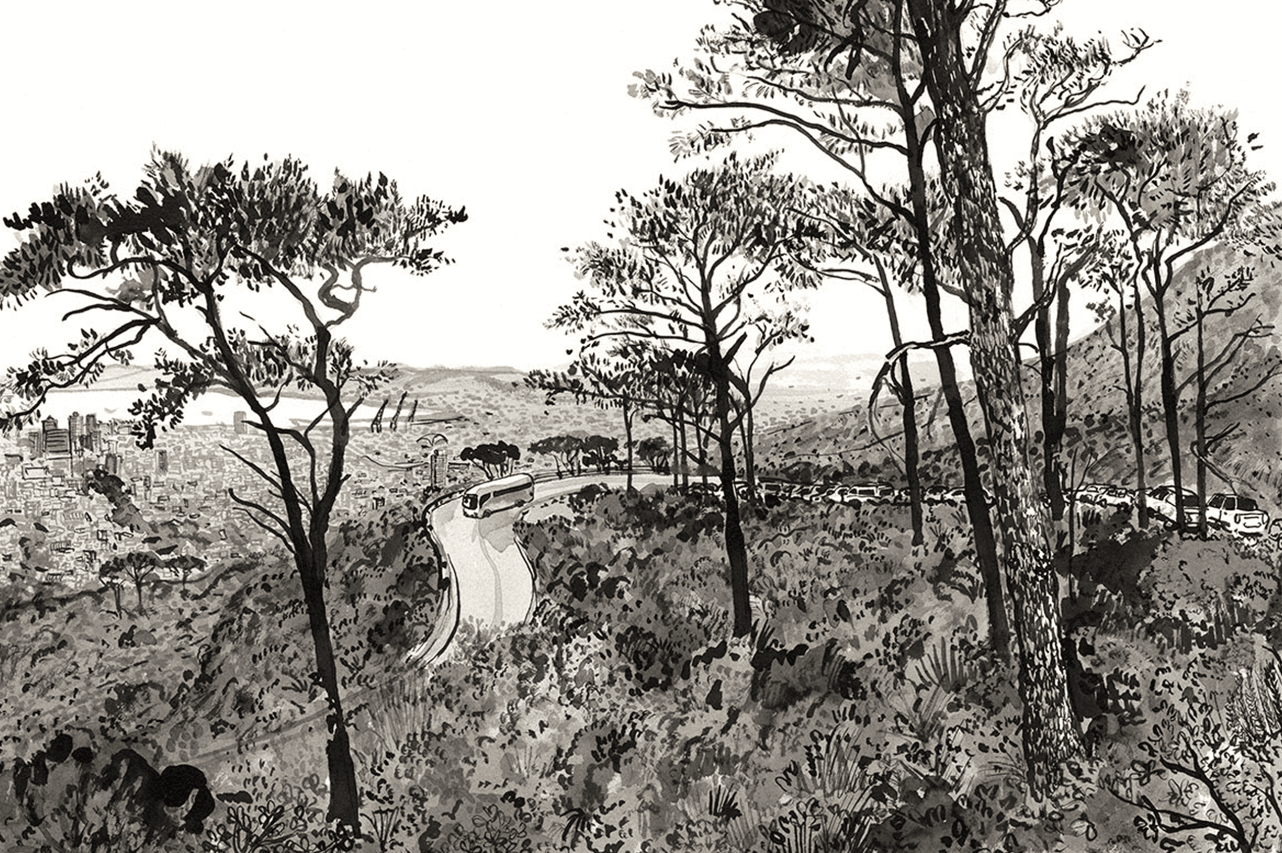 Tafelberg Road is a wallpaper design that forms part of our CS&Co collection. It is by the artist Lucie Demoyencourt. As with all our designs, it will be redesigned to suit your wall size and shape.