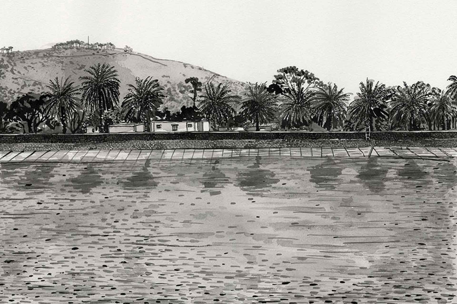 Upper Orange Reservoir is a wallpaper design that forms part of our CS&Co collection. It is by the artist Lucie Demoyencourt. As with all our designs, it will be redesigned to suit your wall size and shape.