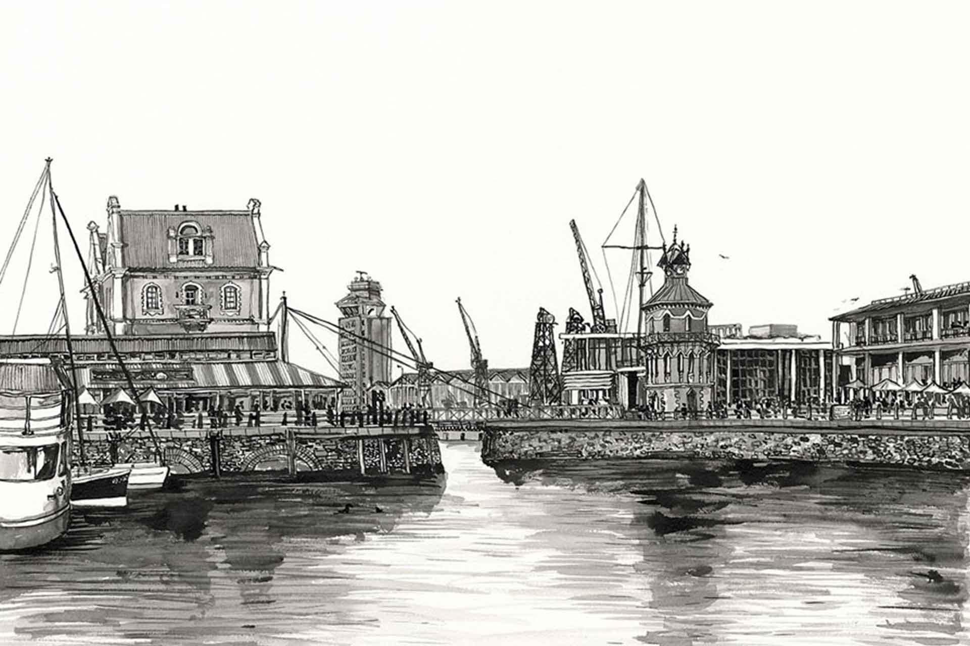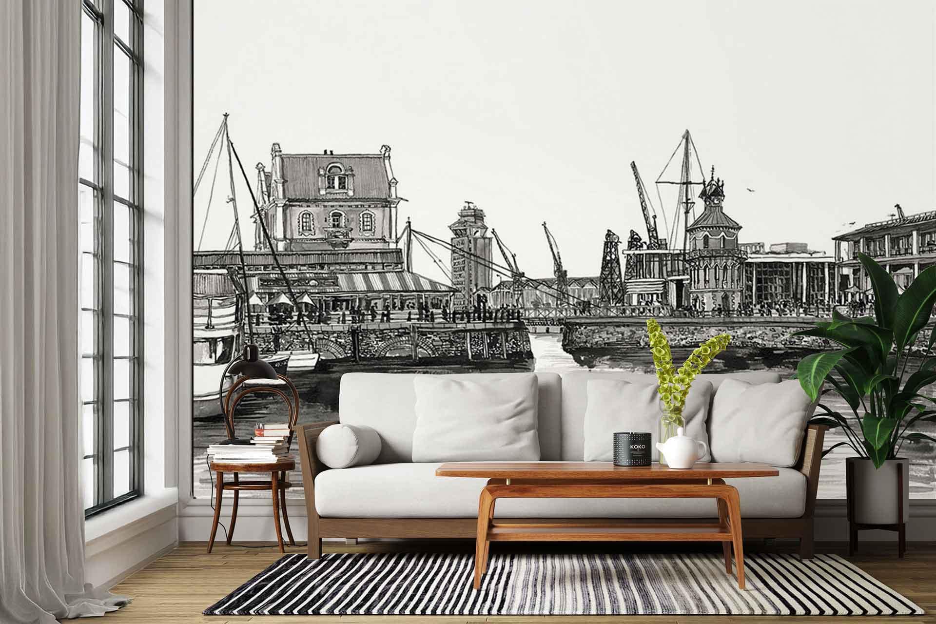 Waterfront Clocktower is a wallpaper design that forms part of our CS&Co collection. It is by the artist Lucie Demoyencourt. As with all our designs, it will be redesigned to suit your wall size and shape.