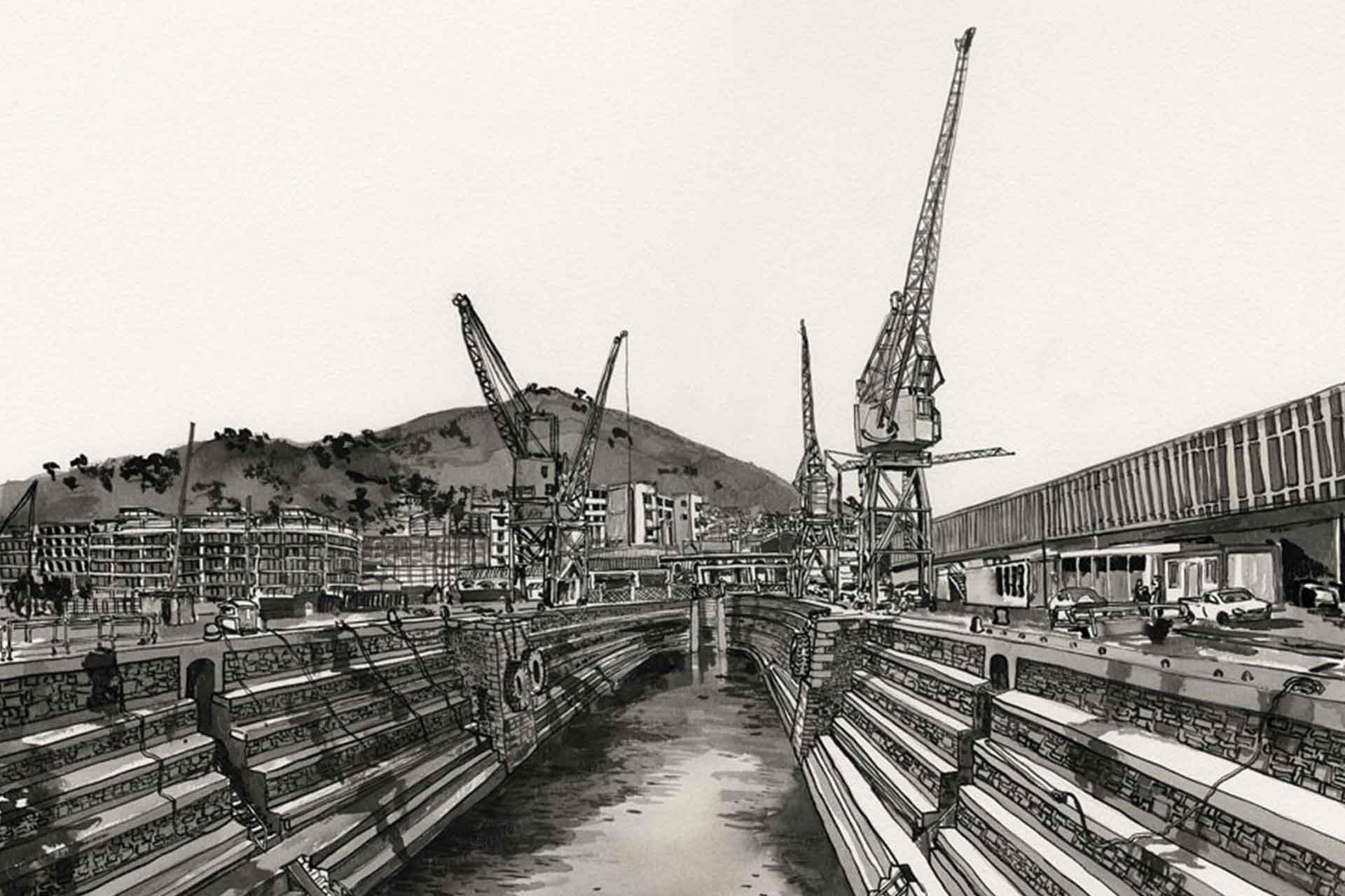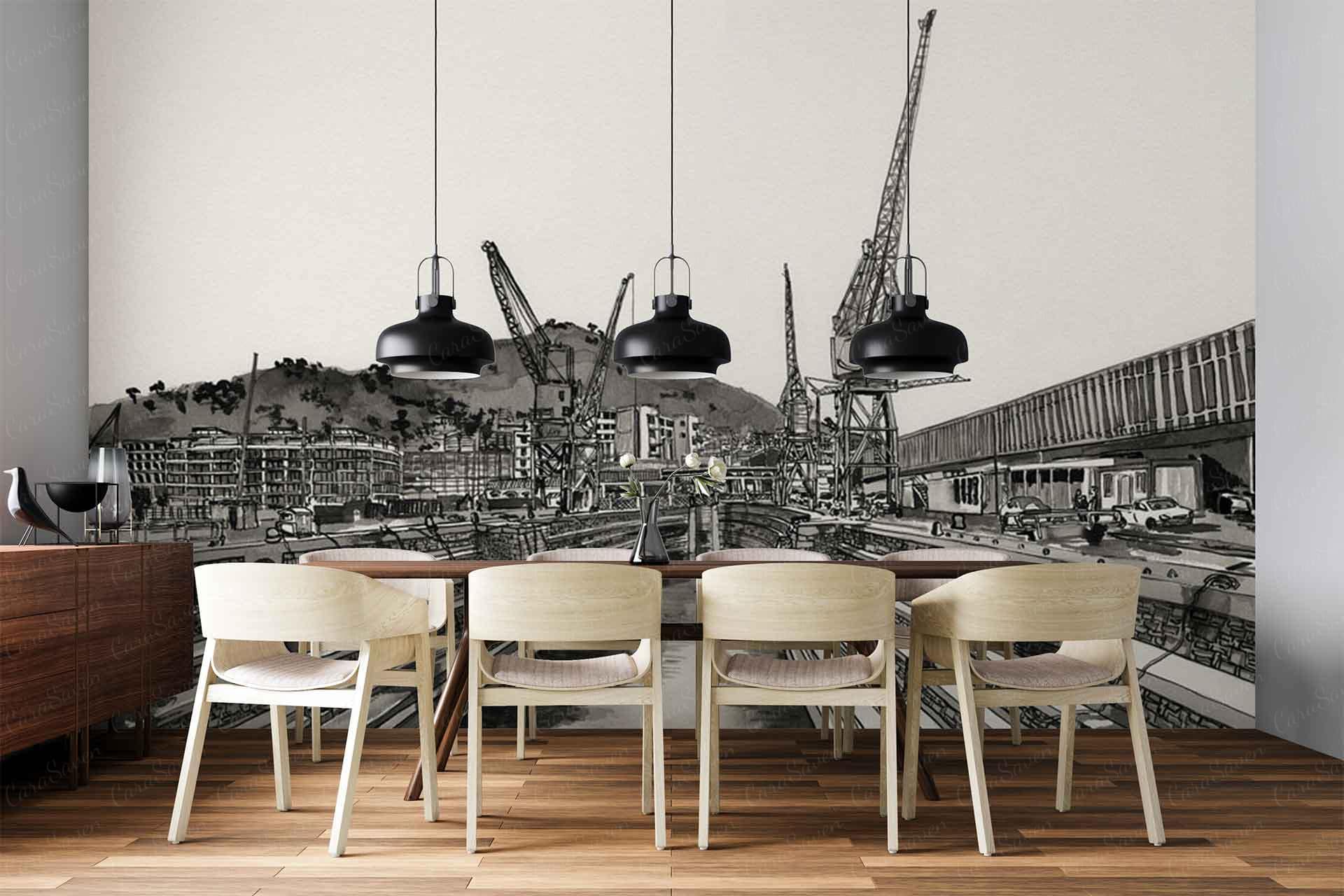 Waterfront Dry Dock is a wallpaper design that forms part of our CS&Co collection. It is by the artist Lucie Demoyencourt. As with all our designs, it will be redesigned to suit your wall size and shape.