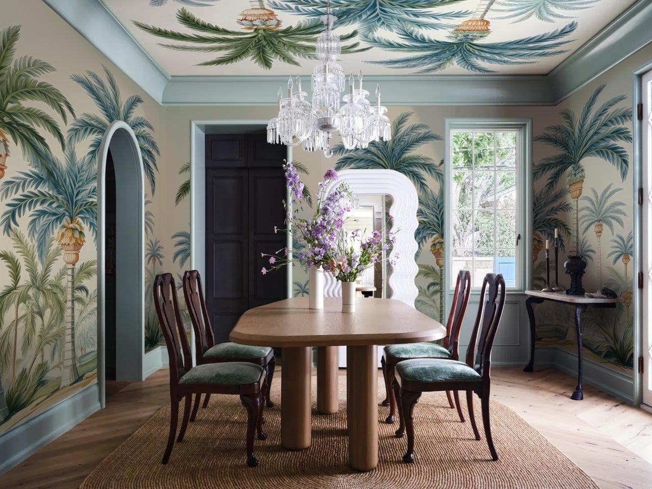 The bathroom features decorative wallpaper with bold, colorful floral patterns in shades of pink, green, and white. The distinctive wallpaper adds a vibrant backdrop behind the vanity and mirrors, easily highlighting its eye-catching design for search.