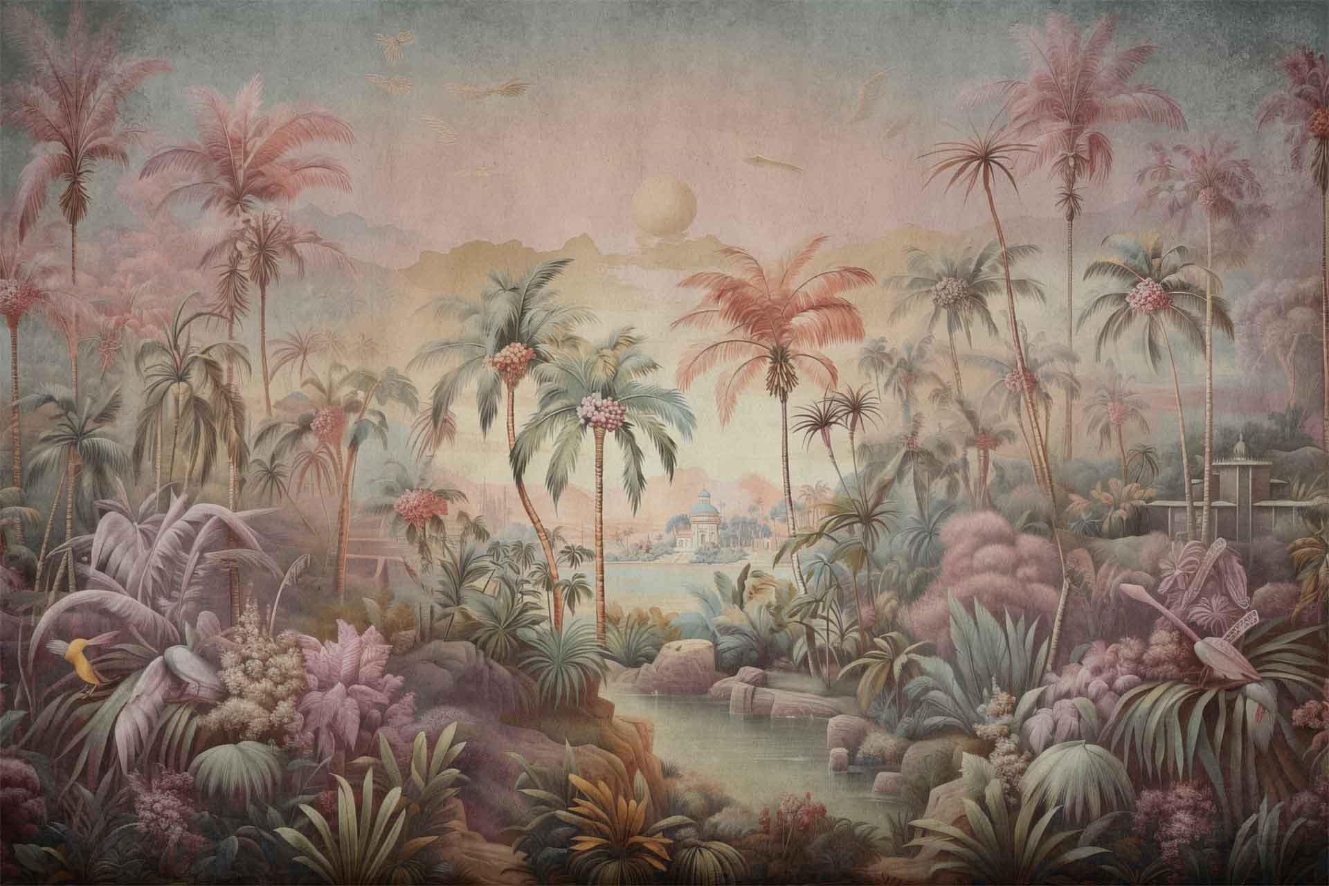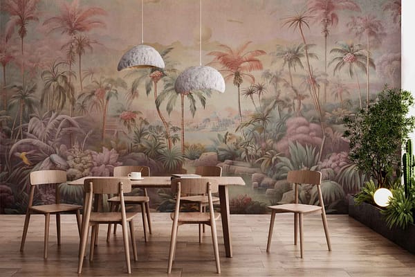 Vibrant floral and bird wallpaper featuring colorful flowers and birds in lively patterns, with bold hues of pink, green, blue, and yellow creating a dynamic focal point in the room.
