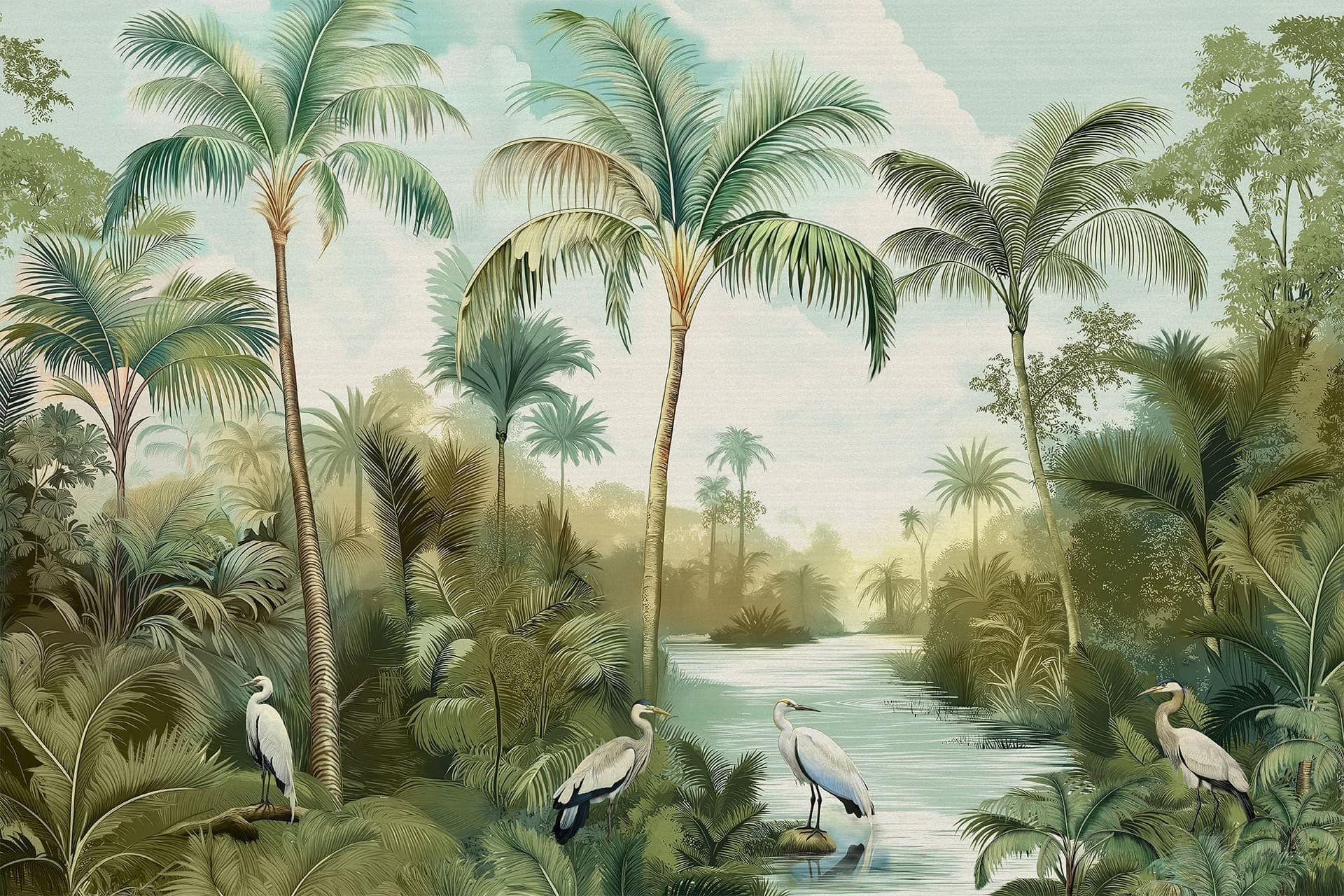 Vibrant floral and bird wallpaper featuring colorful flowers and birds in lively patterns, with bold hues of pink, green, blue, and yellow creating a dynamic focal point in the room.