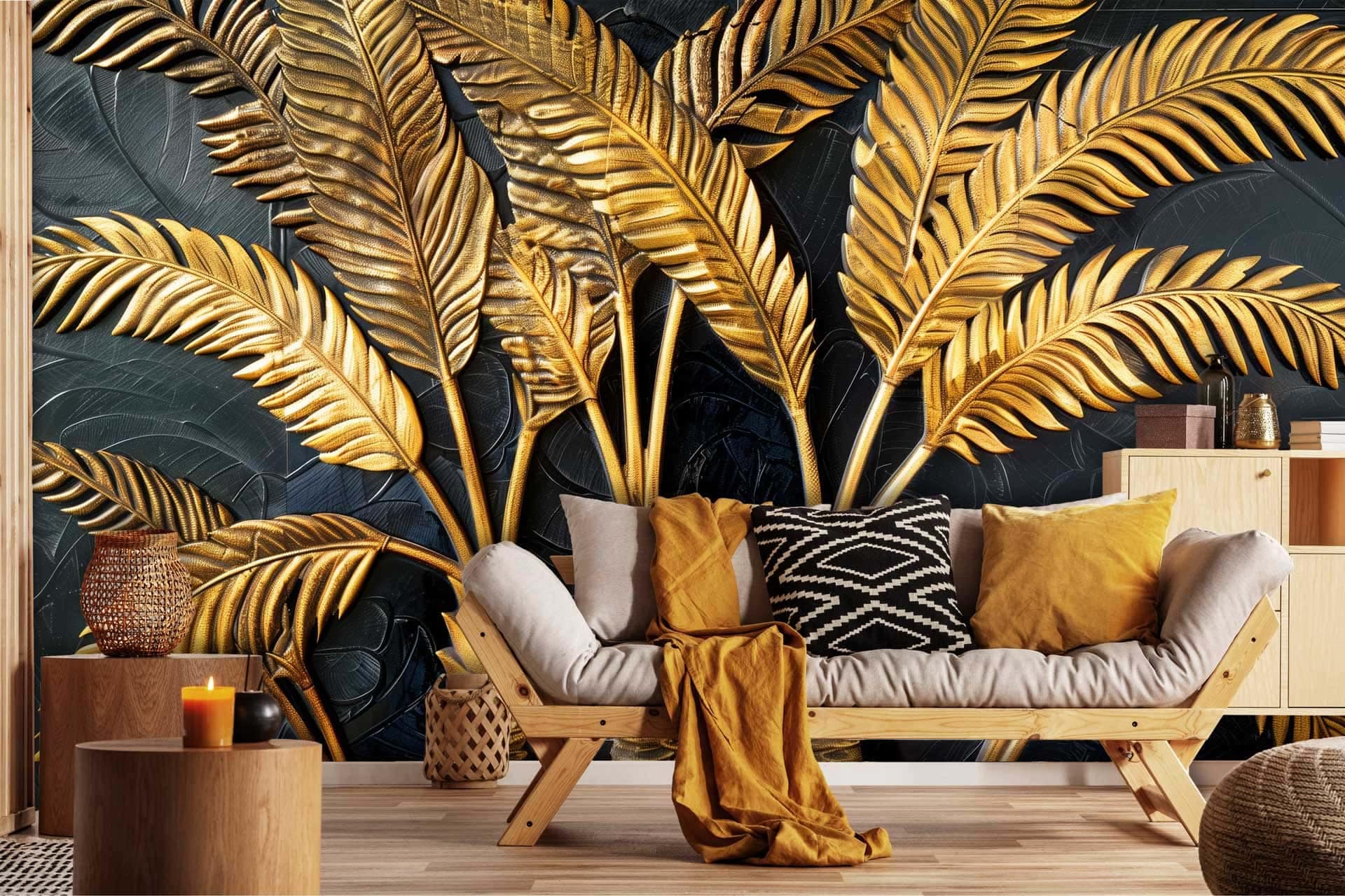 Golden Tropic is a wallpaper design that is part of our Modern Mural collection. As with all our designs, it will be redesigned to suit your wall size and shape. Additional changes can be made to the colour and scale of the design at your request.