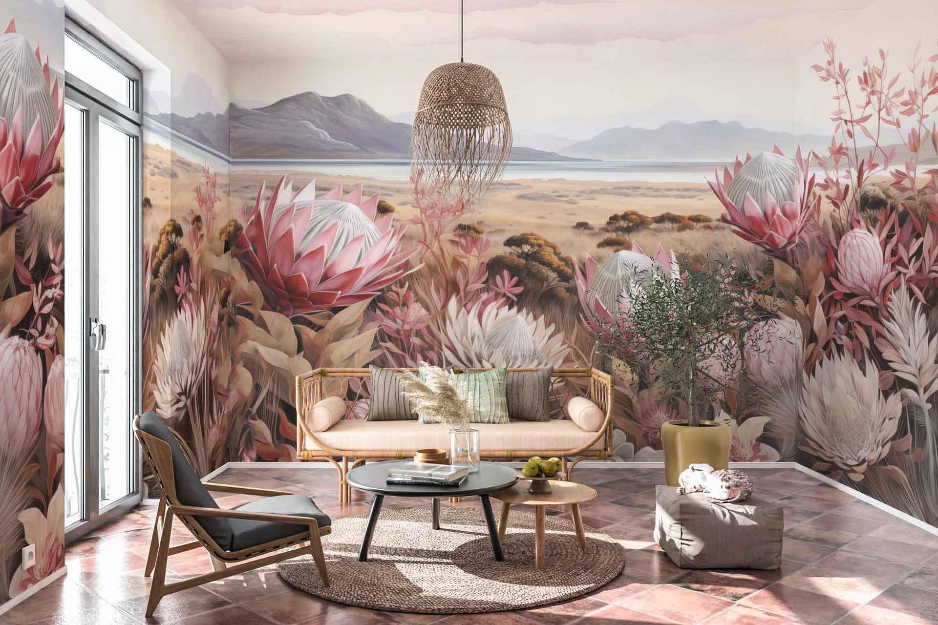 Vibrant floral and bird wallpaper featuring colorful flowers and birds in lively patterns, with bold hues of pink, green, blue, and yellow creating a dynamic focal point in the room.