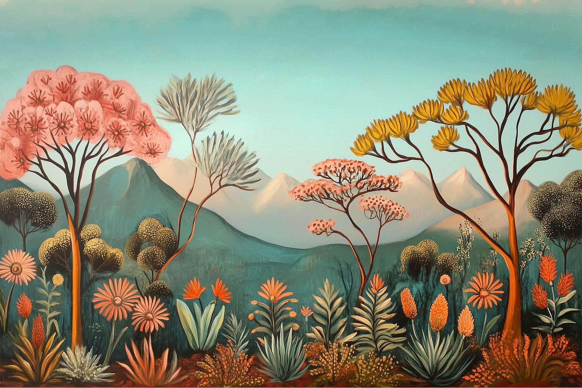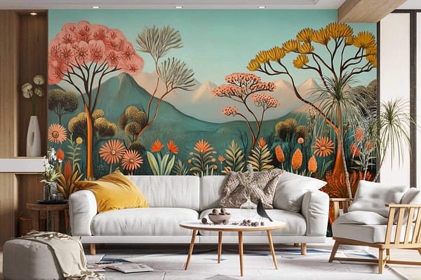 Vibrant floral and bird wallpaper featuring colorful flowers and birds in lively patterns, with bold hues of pink, green, blue, and yellow creating a dynamic focal point in the room.