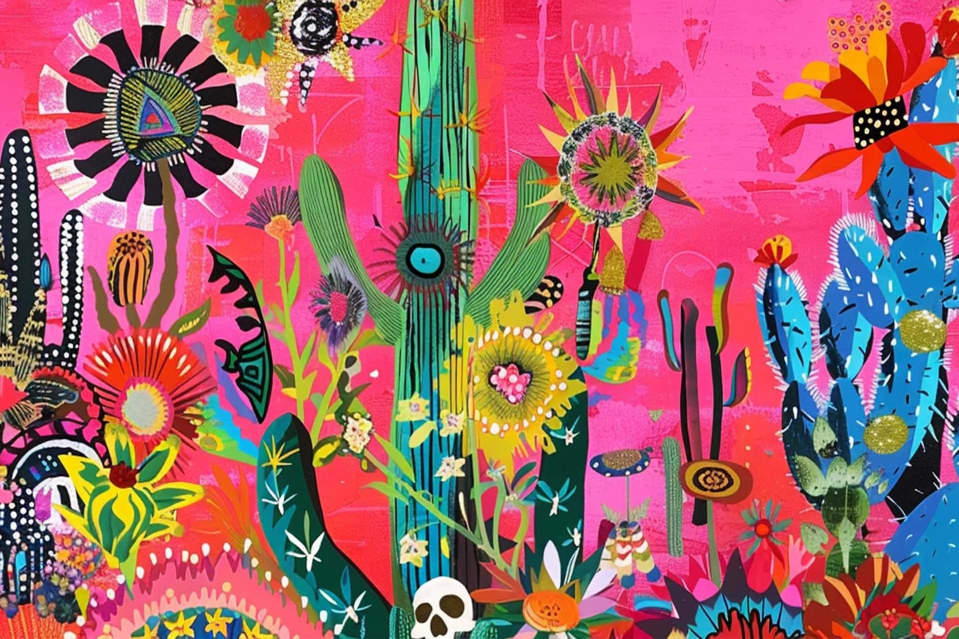 Vibrant floral and bird wallpaper featuring colorful flowers and birds in lively patterns, with bold hues of pink, green, blue, and yellow creating a dynamic focal point in the room.