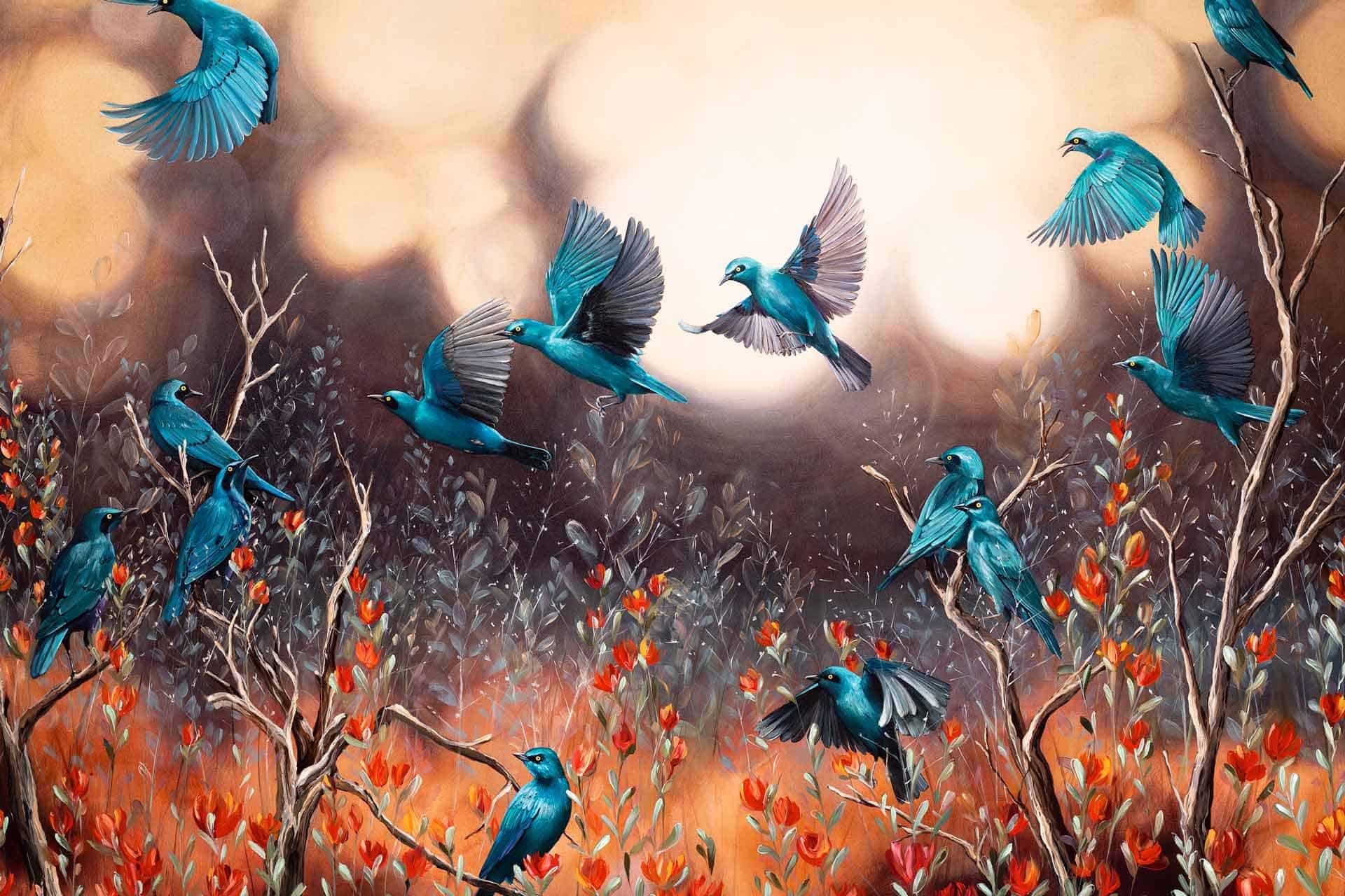 Vibrant floral and bird wallpaper featuring colorful flowers and birds in lively patterns, with bold hues of pink, green, blue, and yellow creating a dynamic focal point in the room.