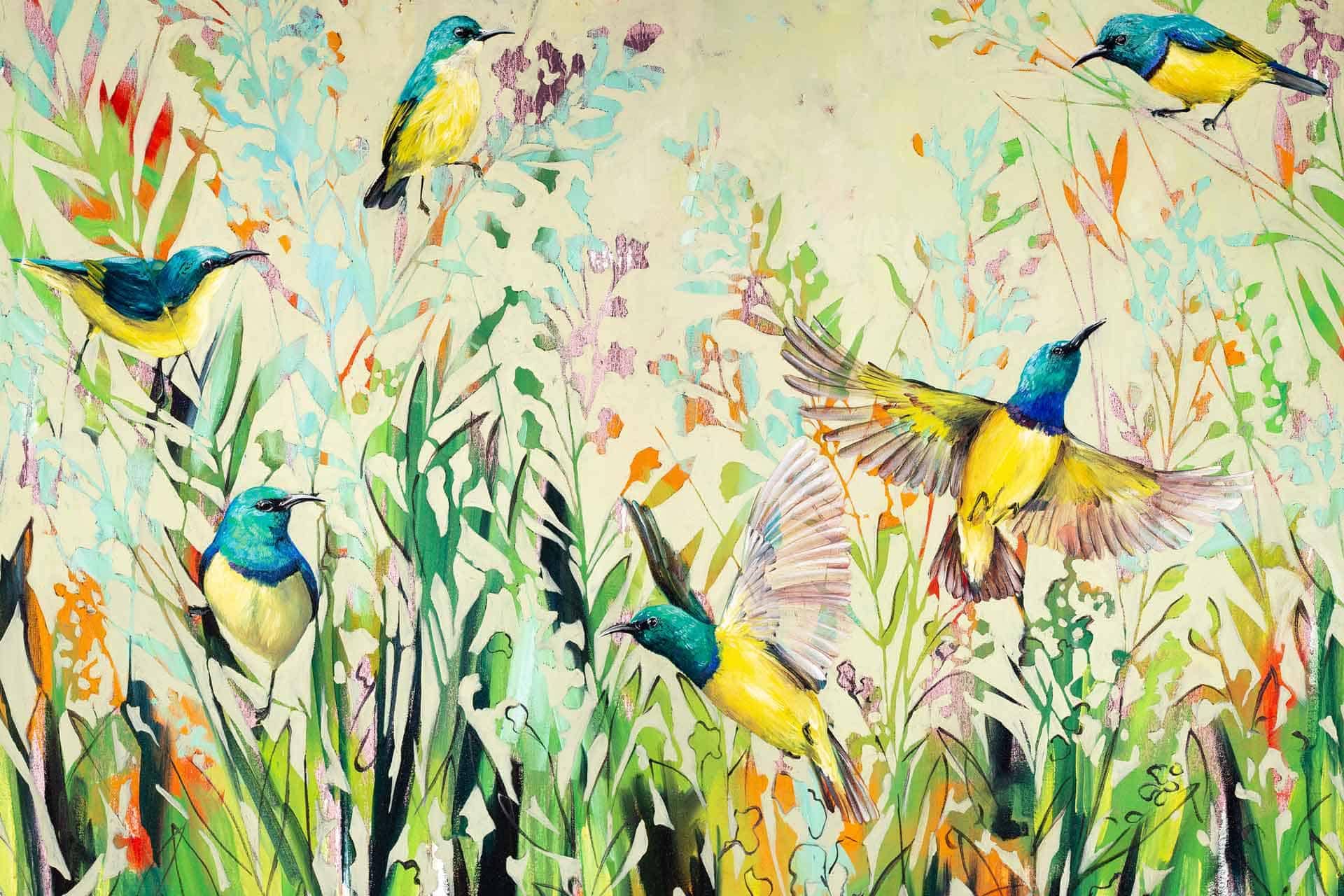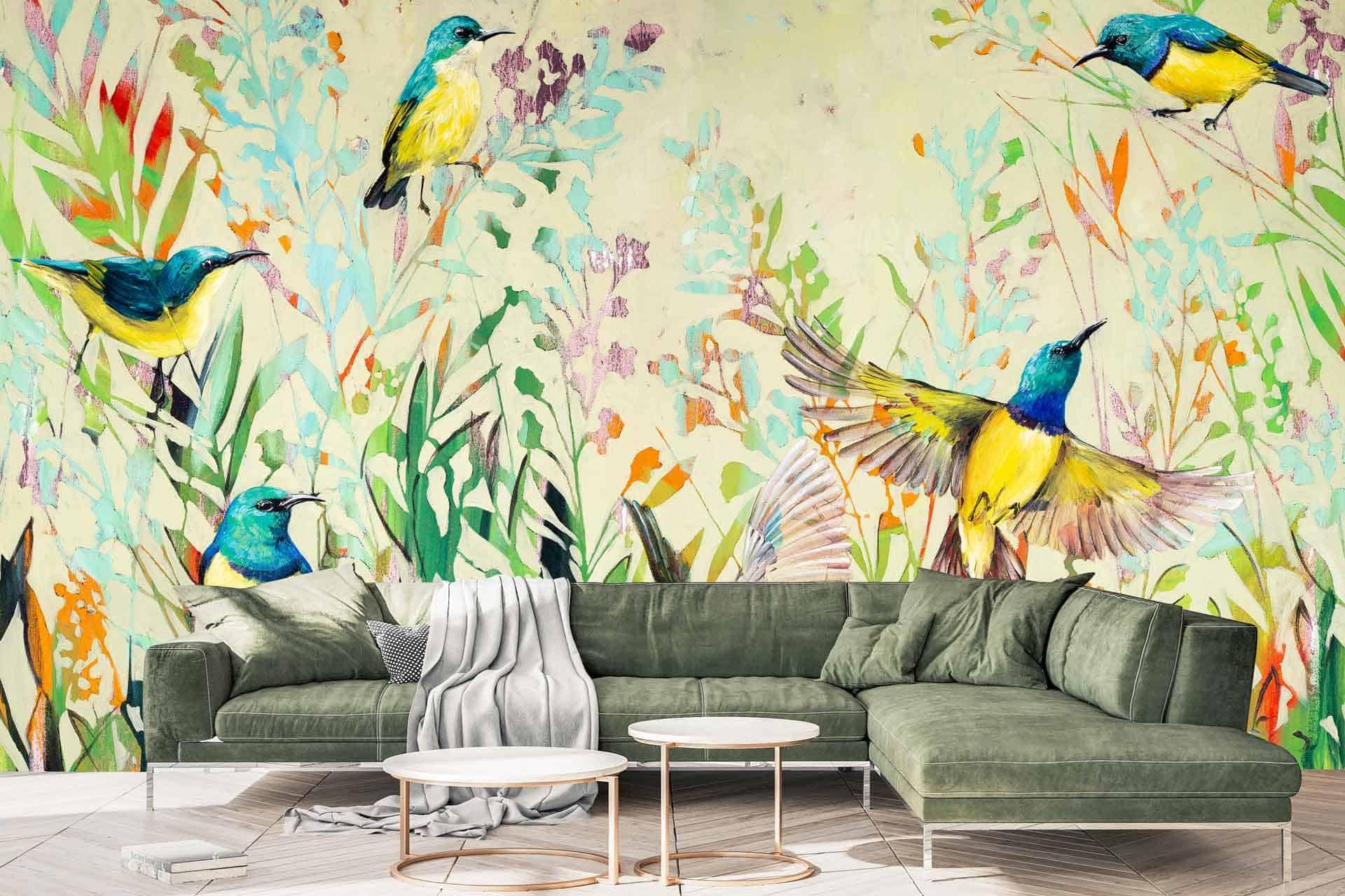 Vibrant floral and bird wallpaper featuring colorful flowers and birds in lively patterns, with bold hues of pink, green, blue, and yellow creating a dynamic focal point in the room.