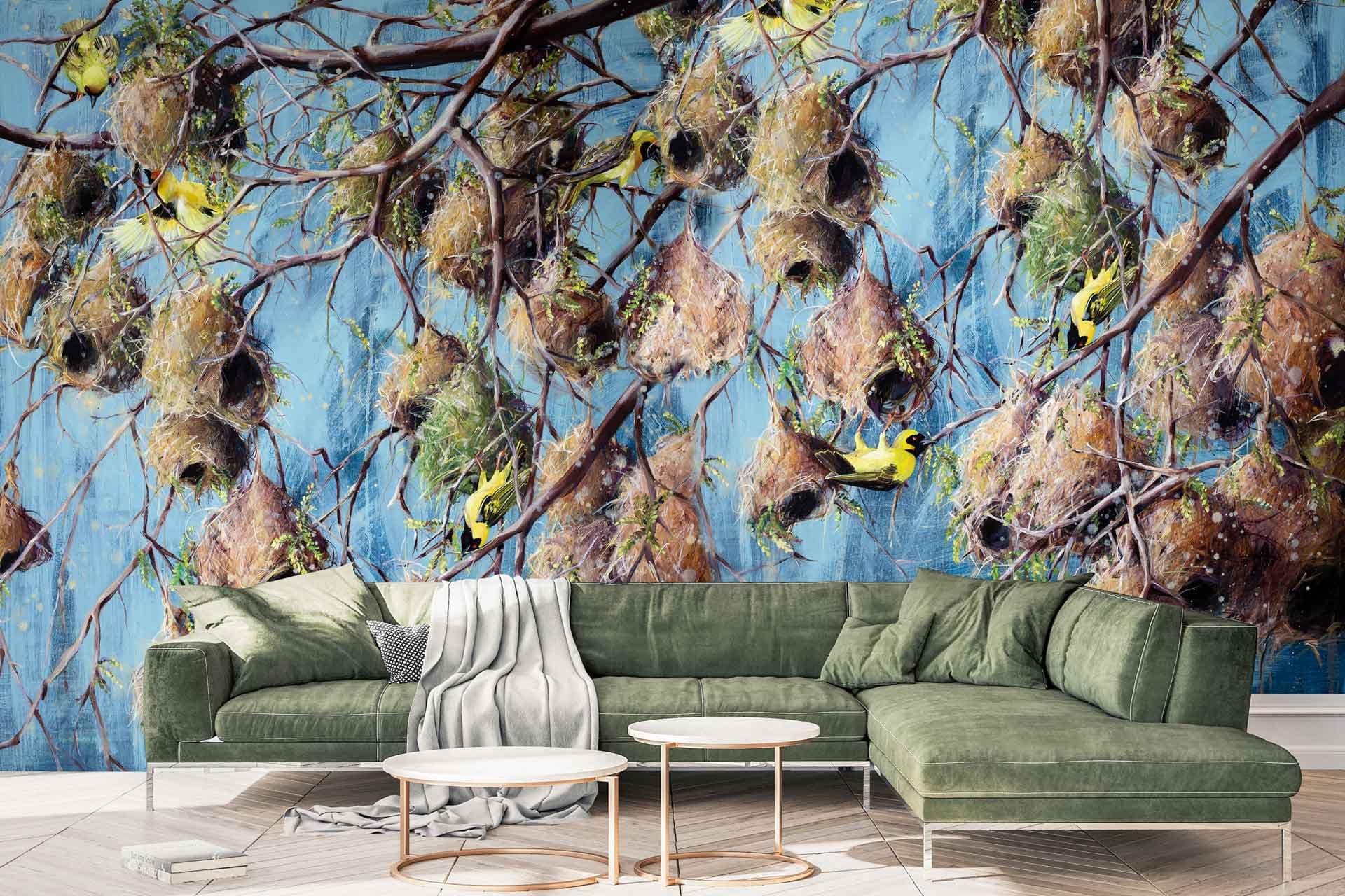 Vibrant floral and bird wallpaper featuring colorful flowers and birds in lively patterns, with bold hues of pink, green, blue, and yellow creating a dynamic focal point in the room.