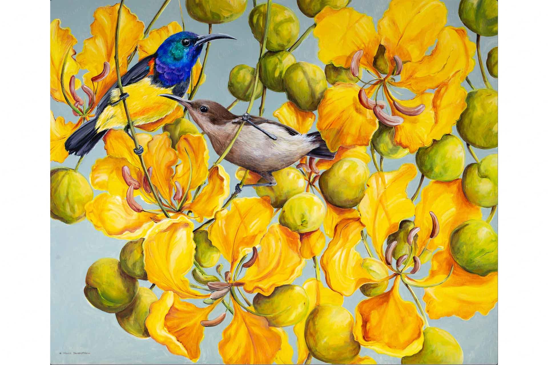 Vibrant floral and bird wallpaper featuring colorful flowers and birds in lively patterns, with bold hues of pink, green, blue, and yellow creating a dynamic focal point in the room.