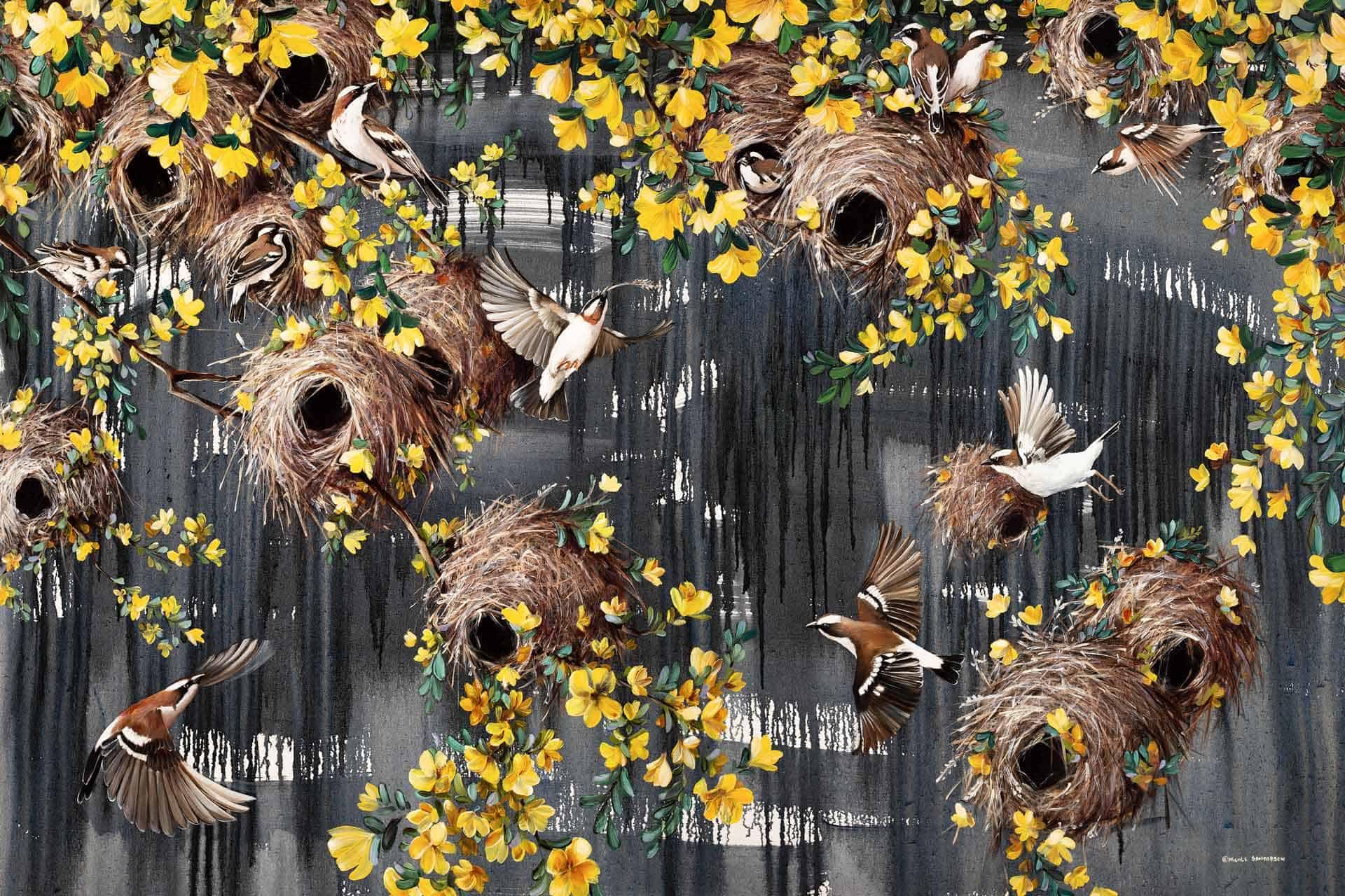 Golden Weavers is a wallpaper design that forms part of our CS&Co collection. It is by the artist Nicole Sanderson. As with all our designs, it will be redesigned to suit your wall size and shape.