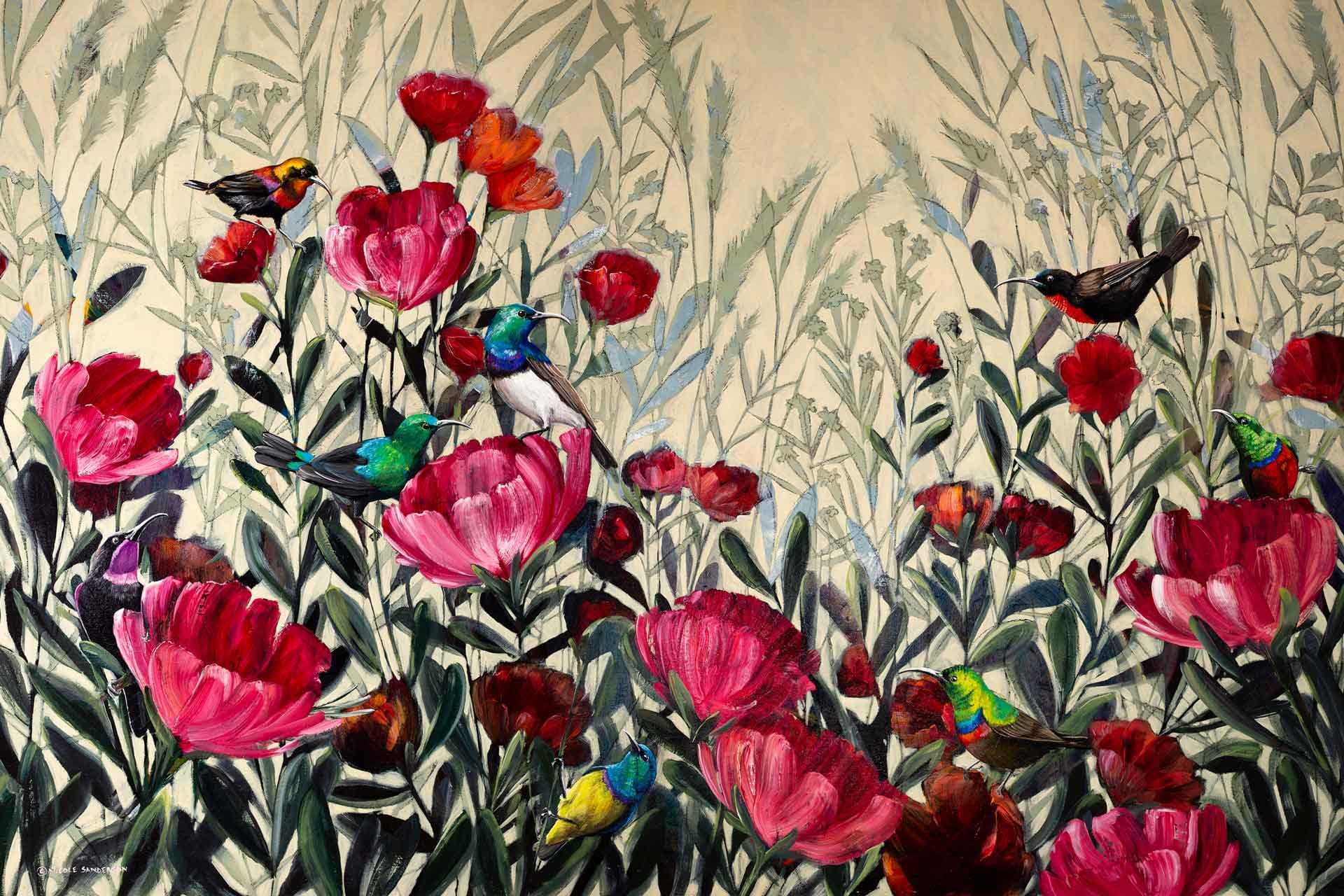 Sunbirds is a wallpaper design that forms part of our CS&Co collection. It is by the artist Nicole Sanderson. As with all our designs, it will be redesigned to suit your wall size and shape.