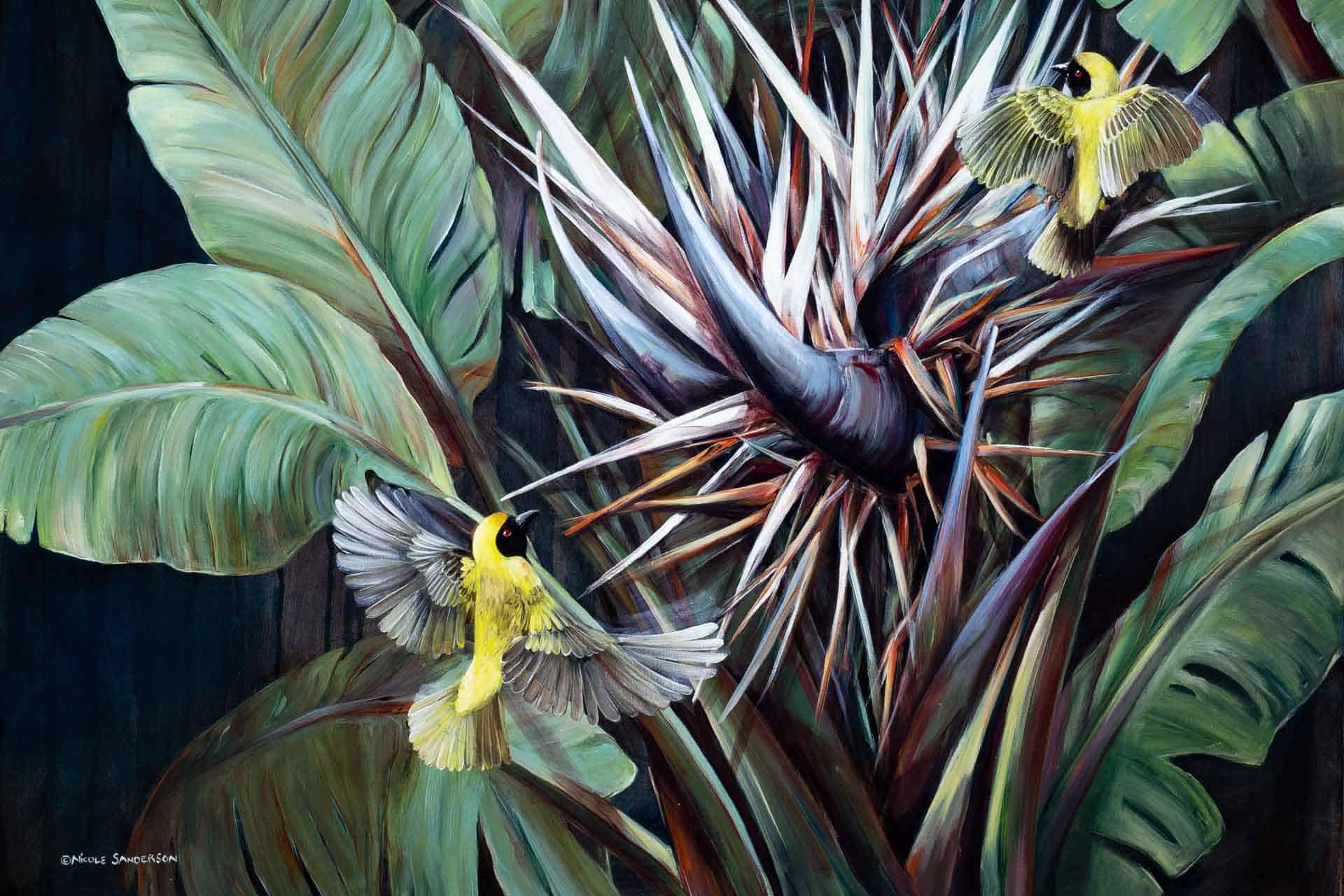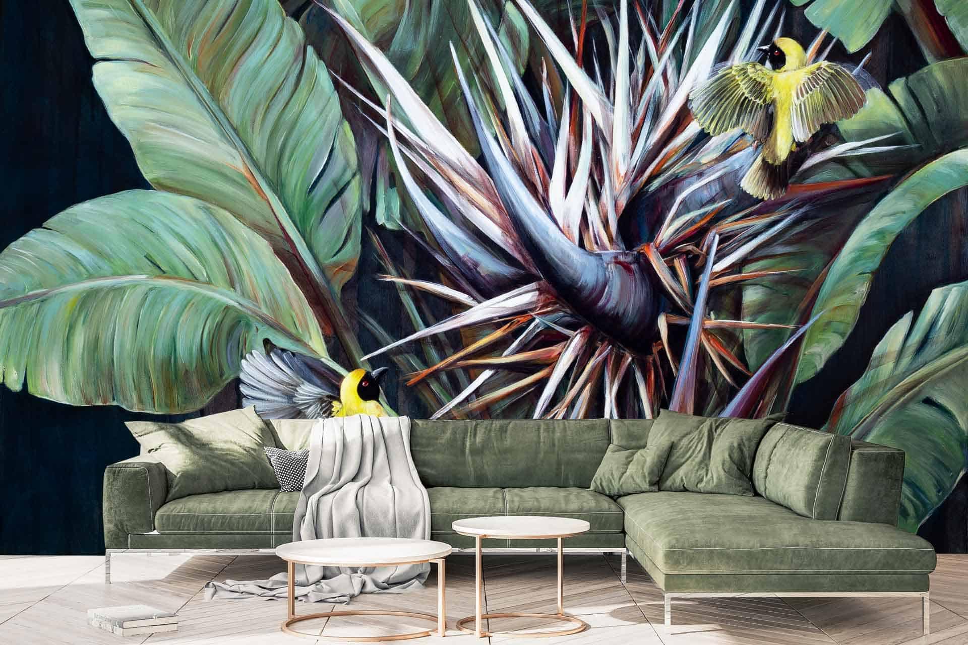 Vibrant floral and bird wallpaper featuring colorful flowers and birds in lively patterns, with bold hues of pink, green, blue, and yellow creating a dynamic focal point in the room.