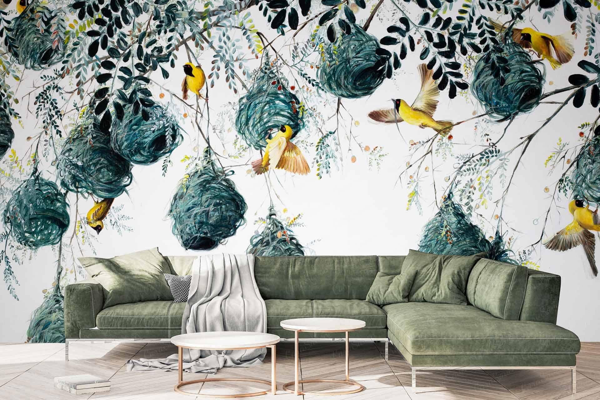 Vibrant floral and bird wallpaper featuring colorful flowers and birds in lively patterns, with bold hues of pink, green, blue, and yellow creating a dynamic focal point in the room.