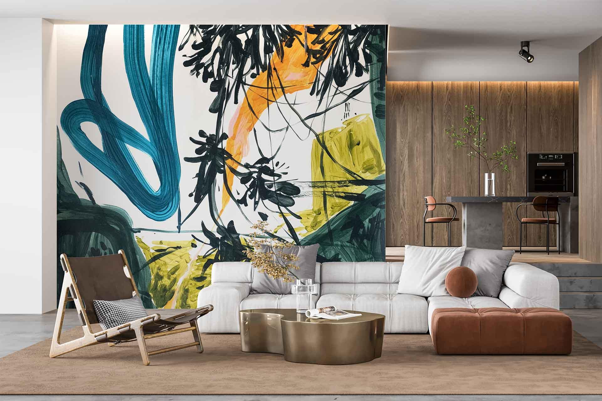Vibrant floral and bird wallpaper featuring colorful flowers and birds in lively patterns, with bold hues of pink, green, blue, and yellow creating a dynamic focal point in the room.