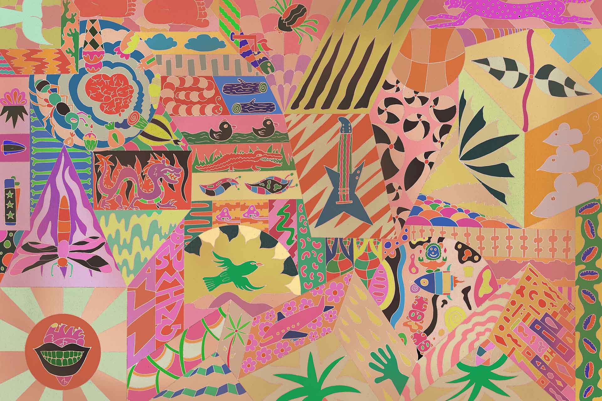 Vibrant floral and bird wallpaper featuring colorful flowers and birds in lively patterns, with bold hues of pink, green, blue, and yellow creating a dynamic focal point in the room.