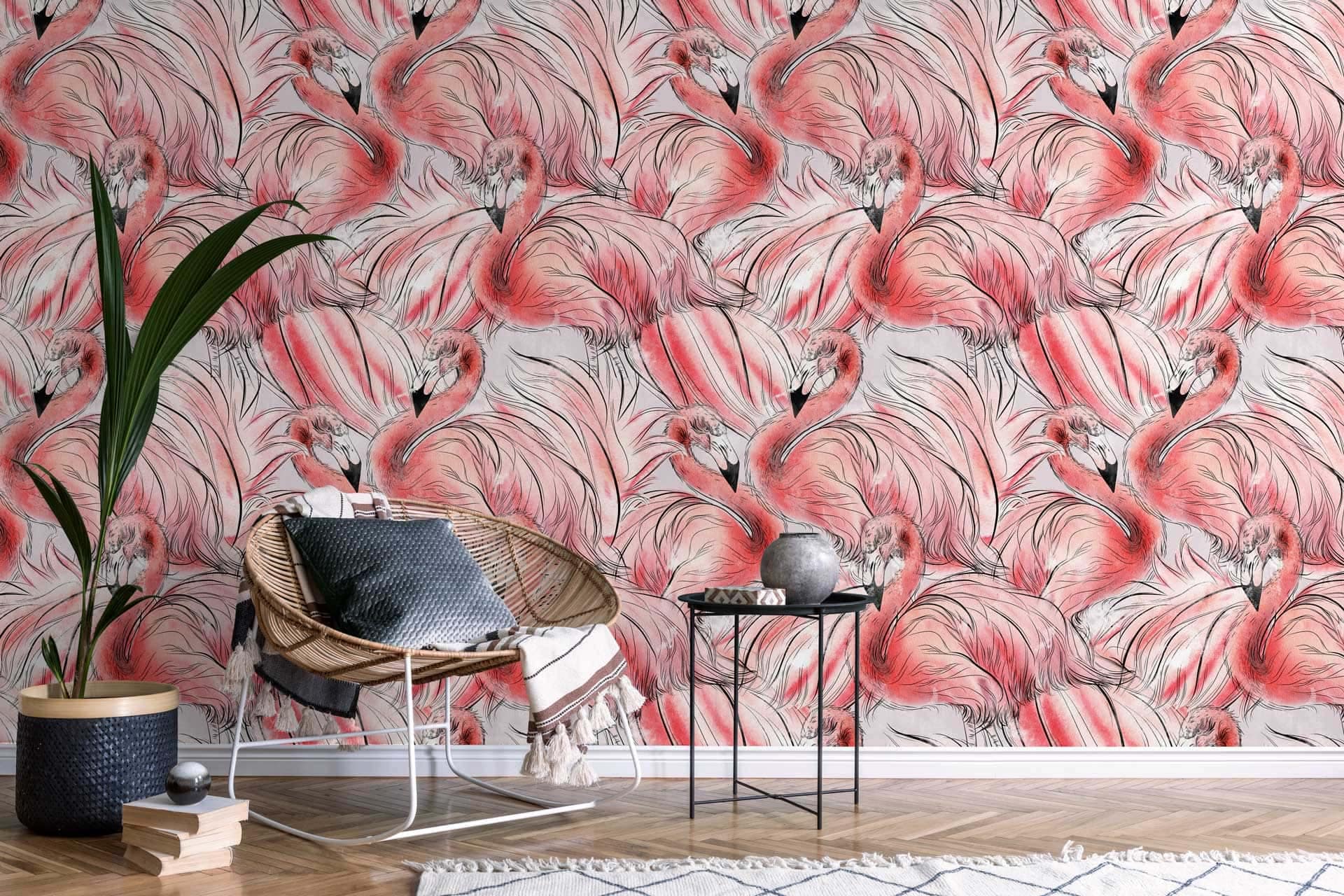Vibrant floral and bird wallpaper featuring colorful flowers and birds in lively patterns, with bold hues of pink, green, blue, and yellow creating a dynamic focal point in the room.
