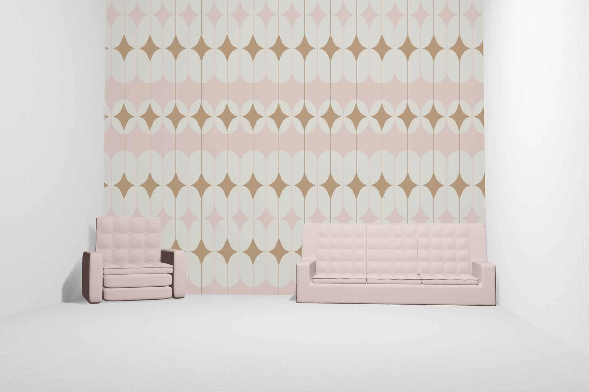Wallpaper visualizer showcases a wallpaper design with distinct elements and colors, making patterns and shades easily searchable. The focus is on the wallpaper's features as displayed within the minimalist interface.