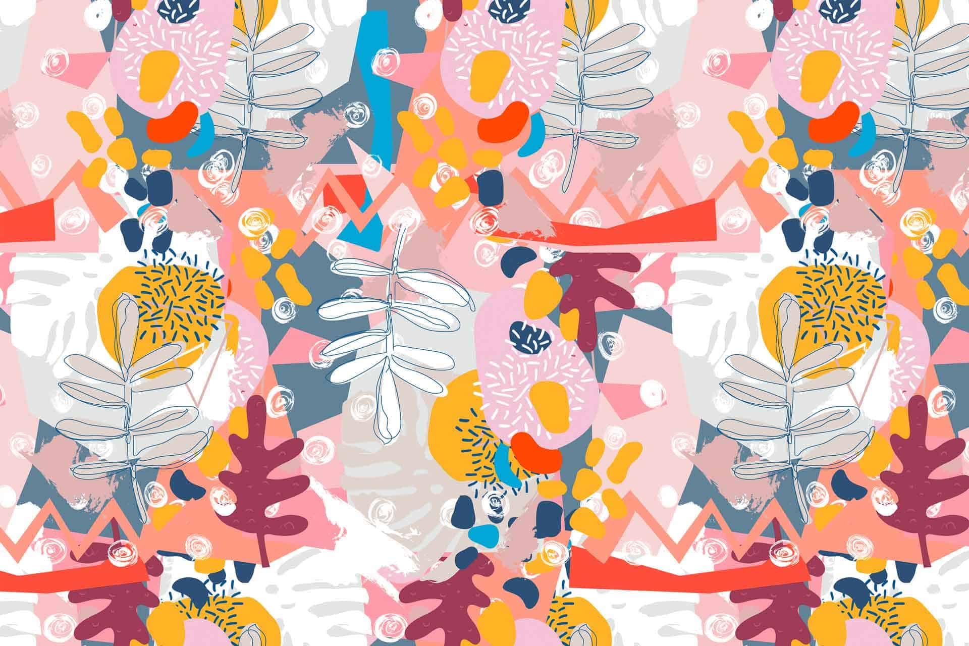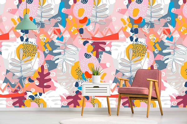Vibrant floral and bird wallpaper featuring colorful flowers and birds in lively patterns, with bold hues of pink, green, blue, and yellow creating a dynamic focal point in the room.