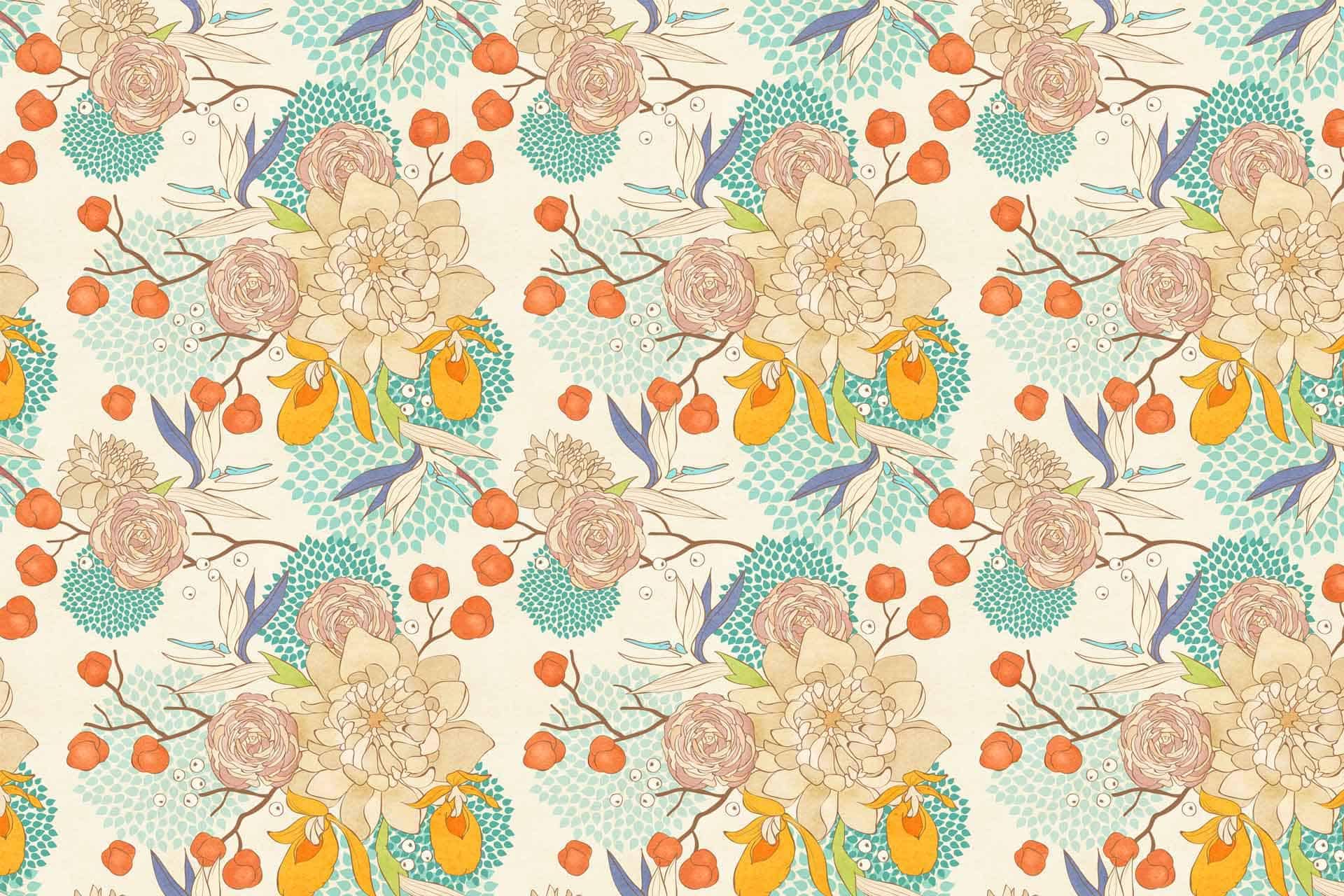Vibrant floral and bird wallpaper featuring colorful flowers and birds in lively patterns, with bold hues of pink, green, blue, and yellow creating a dynamic focal point in the room.