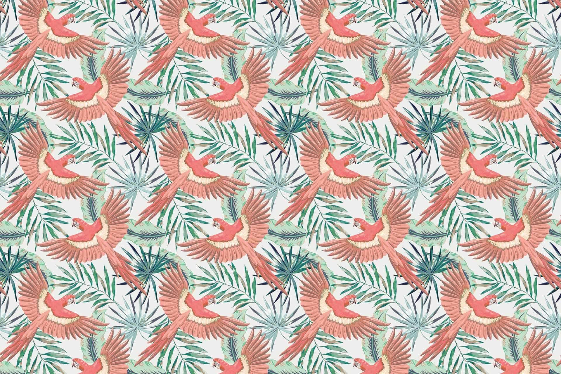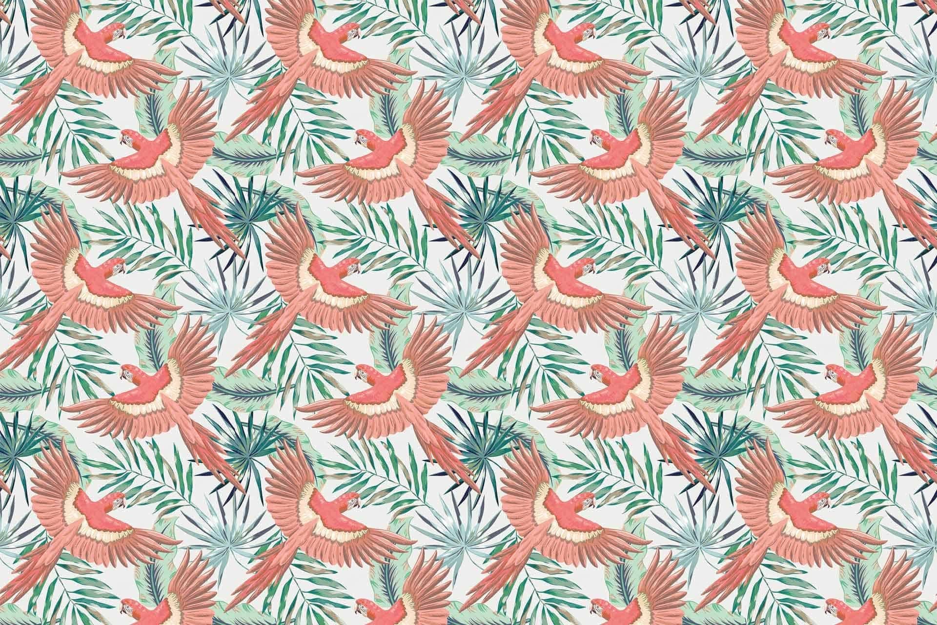 Vibrant floral and bird wallpaper featuring colorful flowers and birds in lively patterns, with bold hues of pink, green, blue, and yellow creating a dynamic focal point in the room.