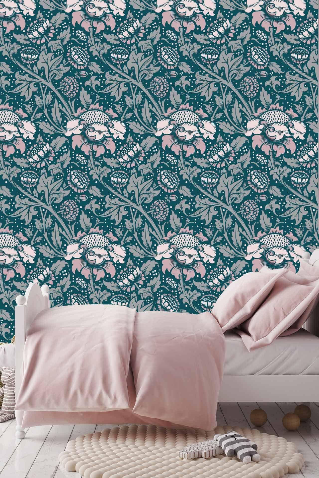 The bathroom features decorative wallpaper with bold, colorful floral patterns in shades of pink, green, and white. The distinctive wallpaper adds a vibrant backdrop behind the vanity and mirrors, easily highlighting its eye-catching design for search.