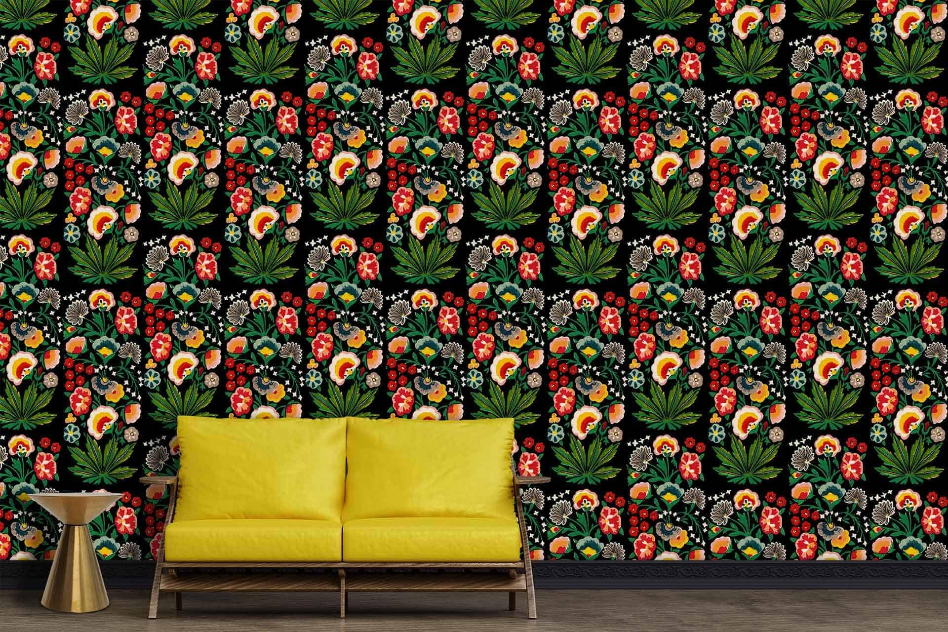Vibrant floral and bird wallpaper featuring colorful flowers and birds in lively patterns, with bold hues of pink, green, blue, and yellow creating a dynamic focal point in the room.
