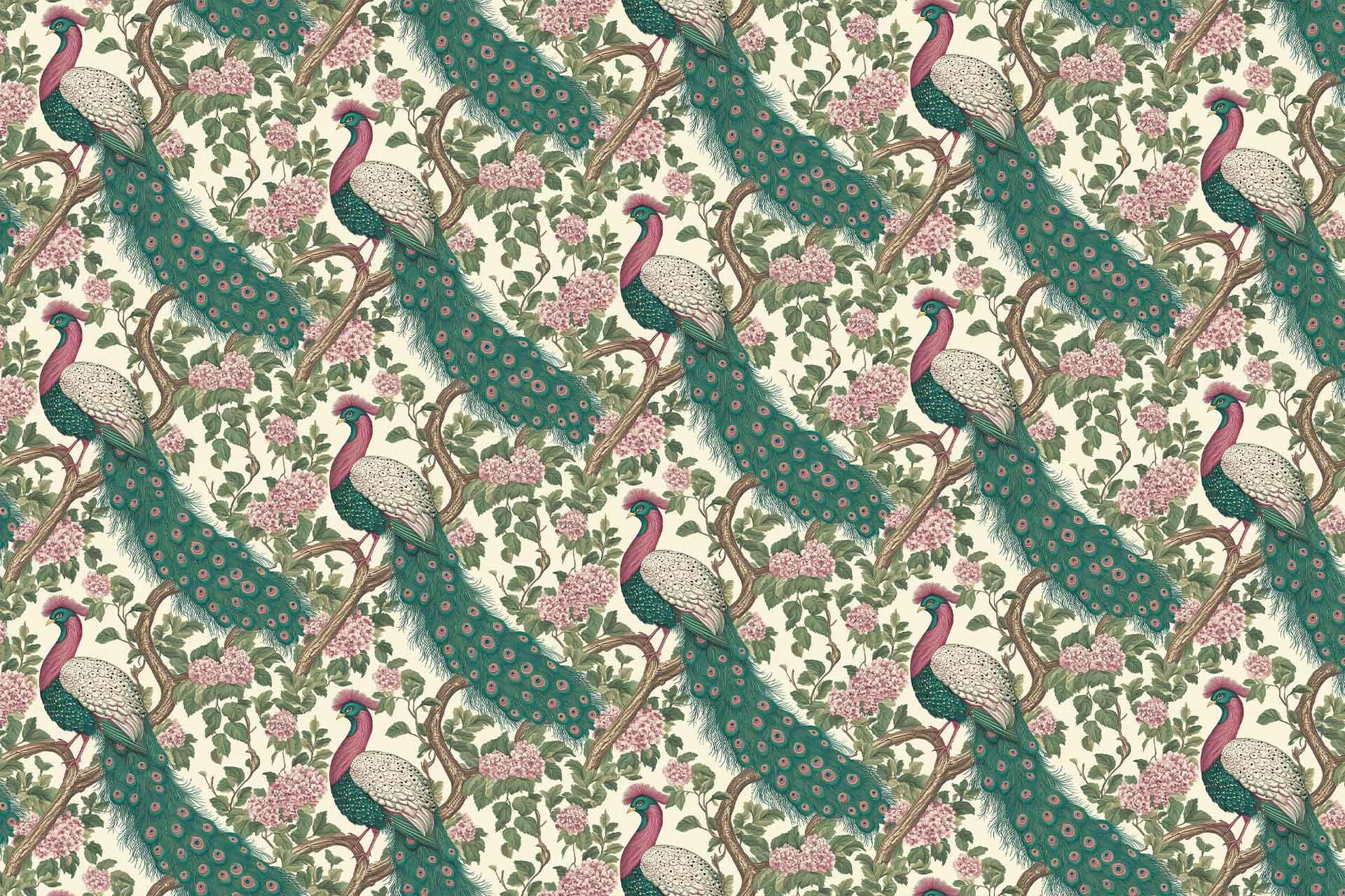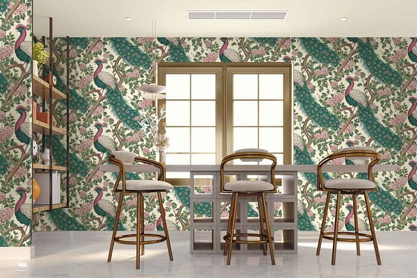 Vibrant floral and bird wallpaper featuring colorful flowers and birds in lively patterns, with bold hues of pink, green, blue, and yellow creating a dynamic focal point in the room.