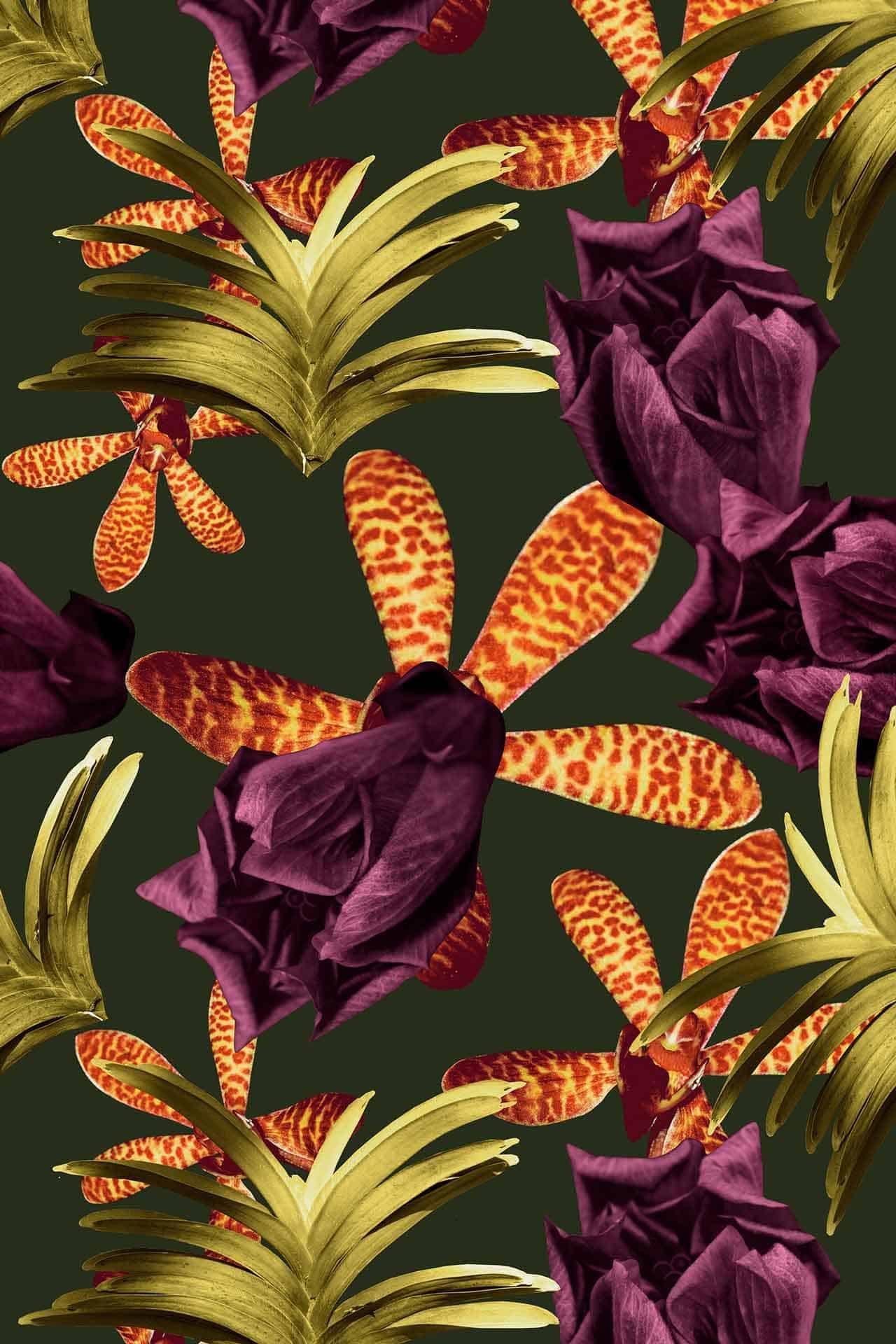 The bathroom features decorative wallpaper with bold, colorful floral patterns in shades of pink, green, and white. The distinctive wallpaper adds a vibrant backdrop behind the vanity and mirrors, easily highlighting its eye-catching design for search.