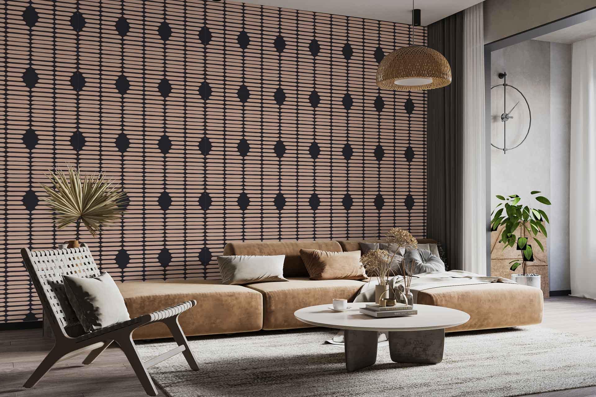 Wallpaper visualizer showcases a wallpaper design with distinct elements and colors, making patterns and shades easily searchable. The focus is on the wallpaper's features as displayed within the minimalist interface.