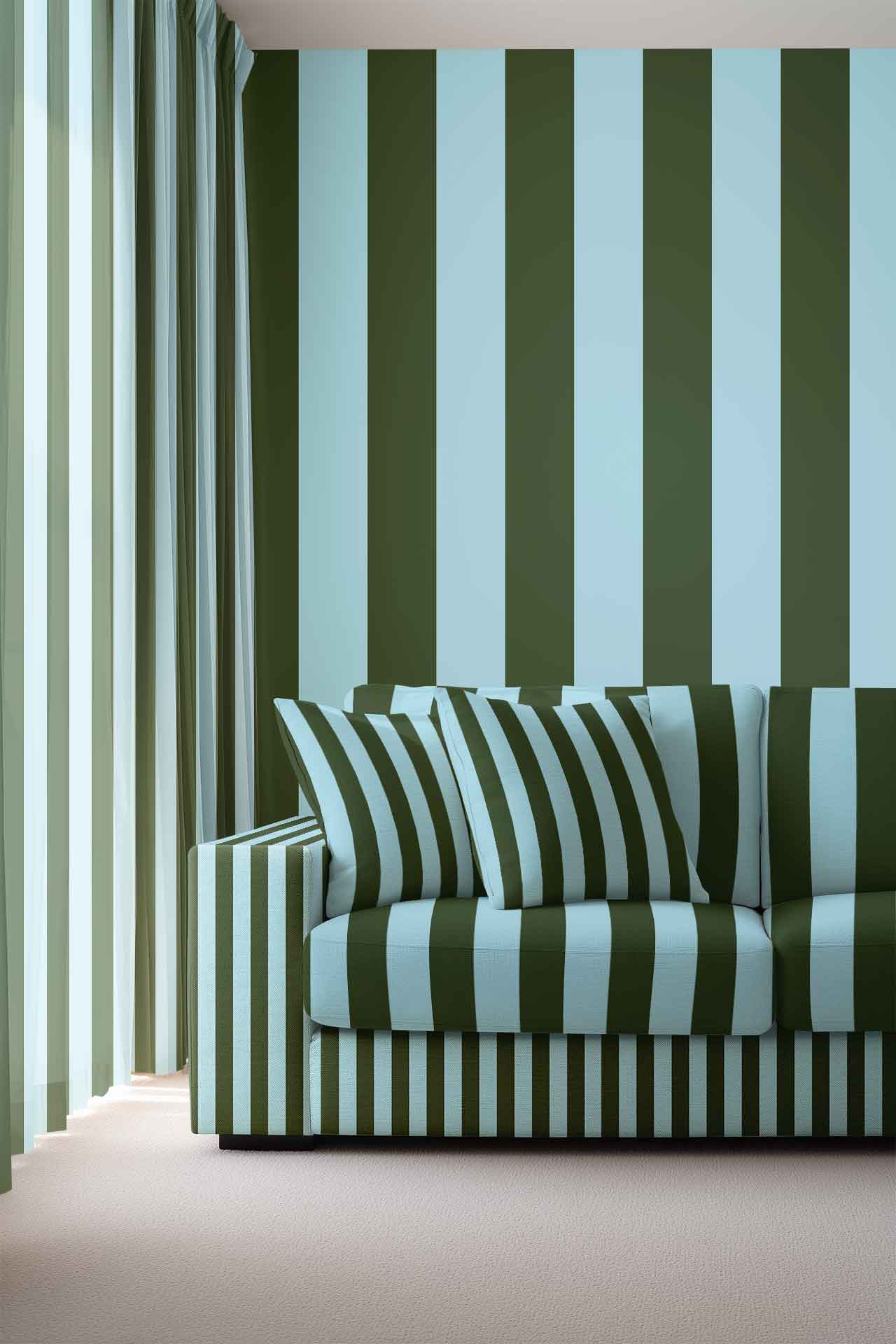 Dark Green & Blue Stripe is a wallpaper design that is part of our Stripes collection. As with all our designs, it will be redesigned to suit your wall size and shape. Additional changes can be made to the colour and scale of the design at your request.