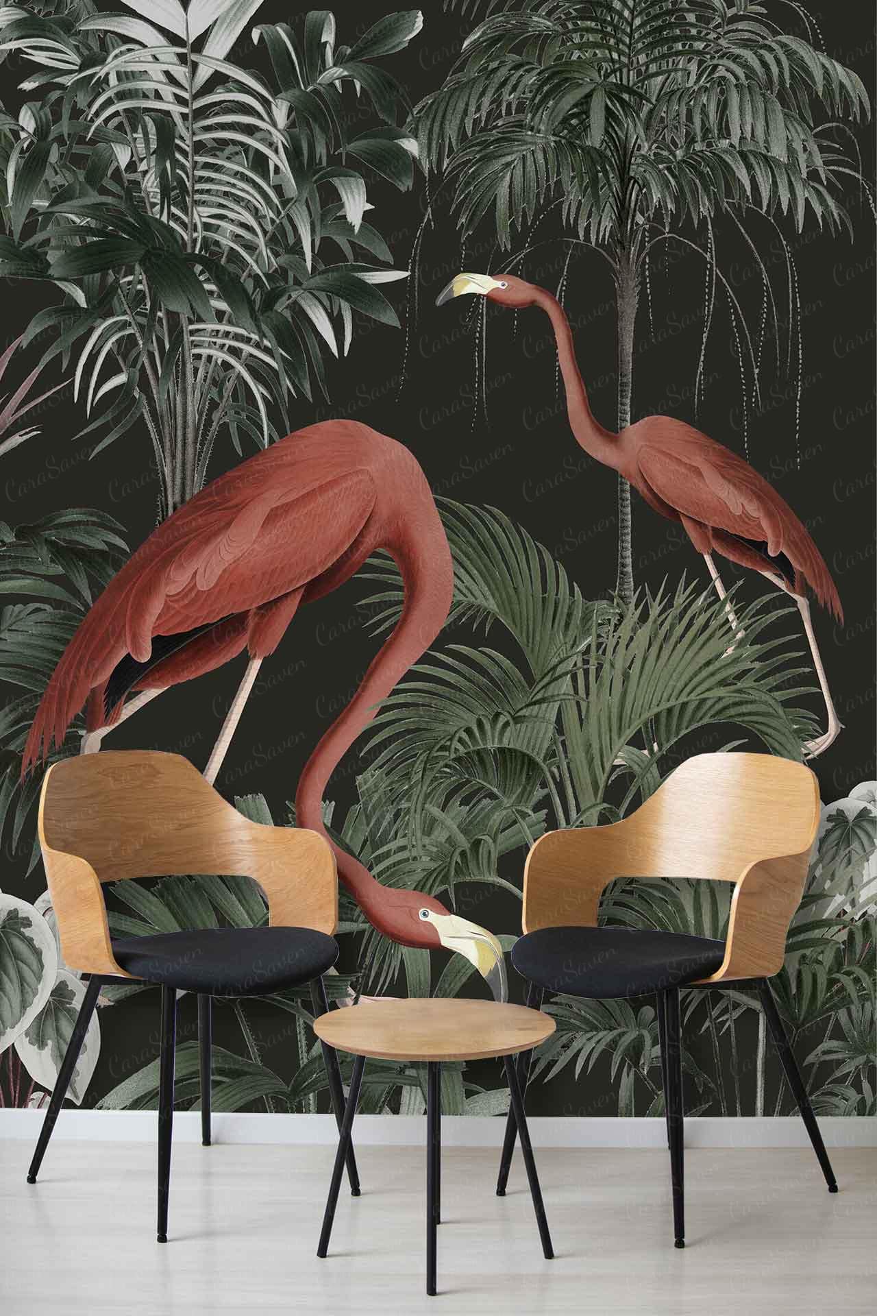 Vibrant floral and bird wallpaper featuring colorful flowers and birds in lively patterns, with bold hues of pink, green, blue, and yellow creating a dynamic focal point in the room.