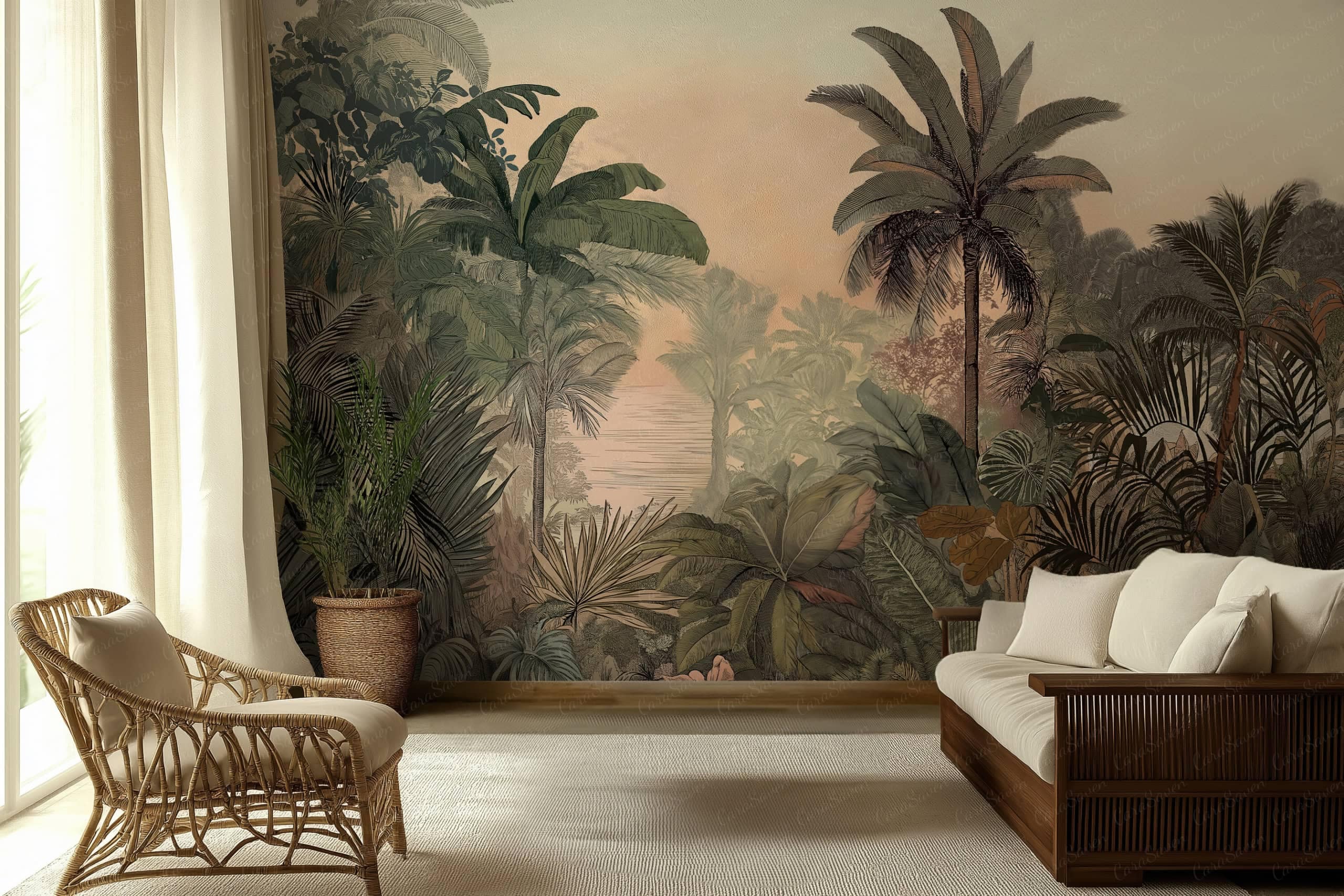 Vibrant floral and bird wallpaper featuring colorful flowers and birds in lively patterns, with bold hues of pink, green, blue, and yellow creating a dynamic focal point in the room.